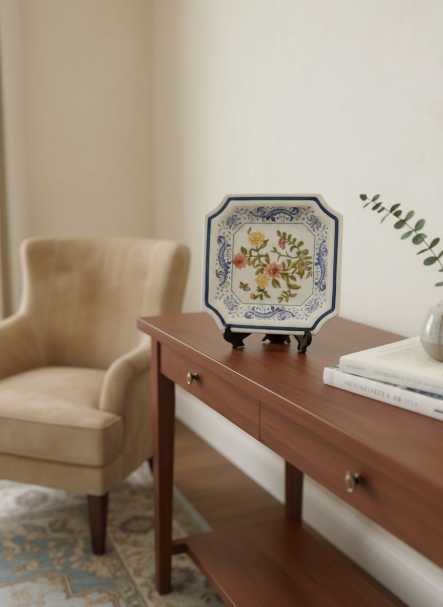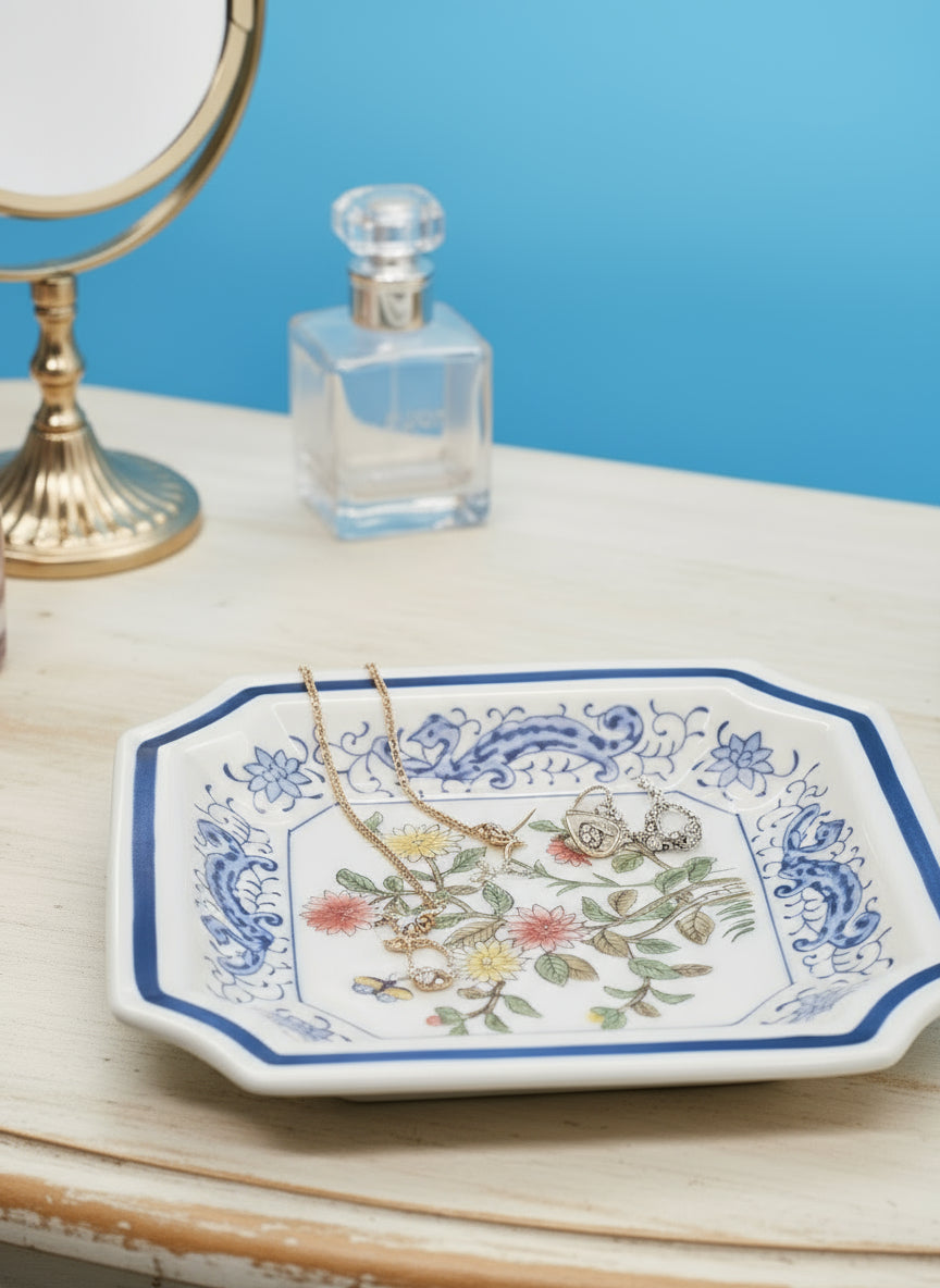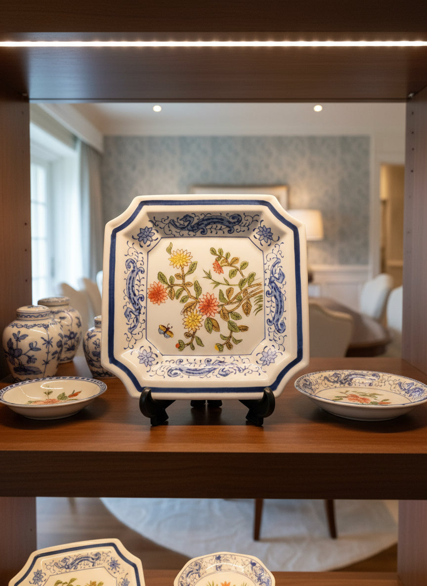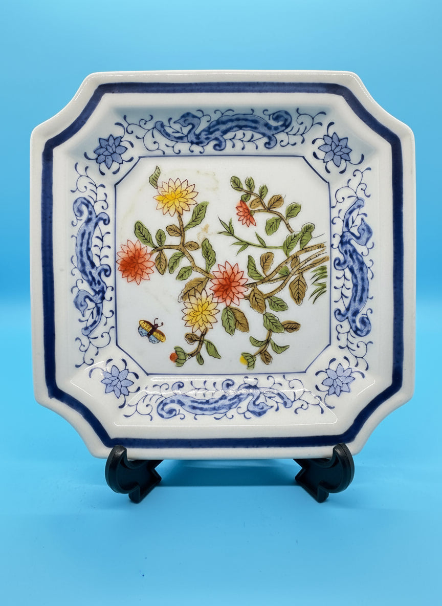 Plato cuadrado de porcelana pintada a mano con diseño de crisantemos y mariposa. Ideal como bandeja decorativa, joyero o pieza de colección.