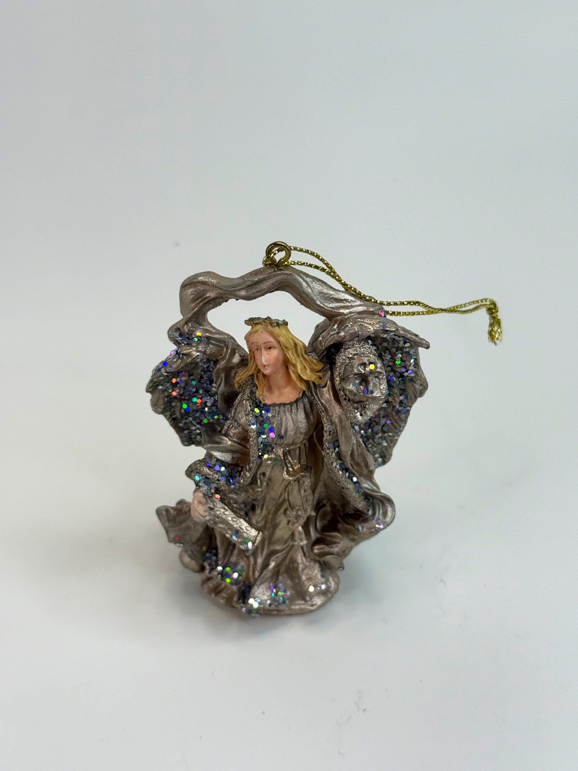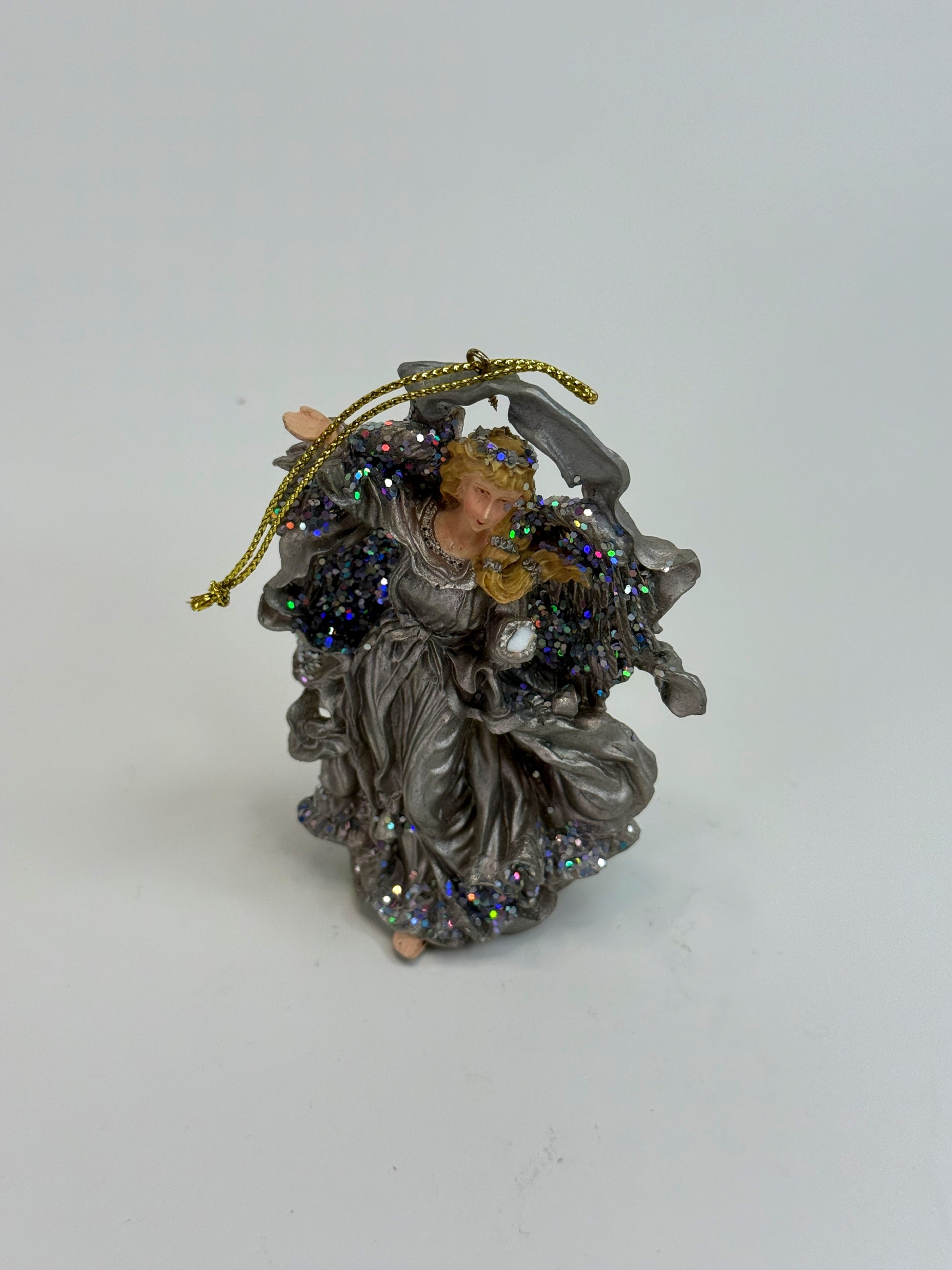 Este delicado adorno de ángel, vestido con una túnica y alas oscuras cubiertas de destellos, encarna la dualidad entre lo celestial y lo terrenal. Su halo dorado y expresión serena lo convierten en un símbolo de paz, protección y celebración.