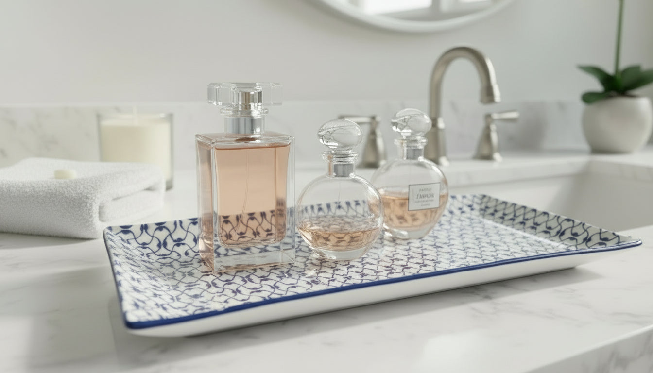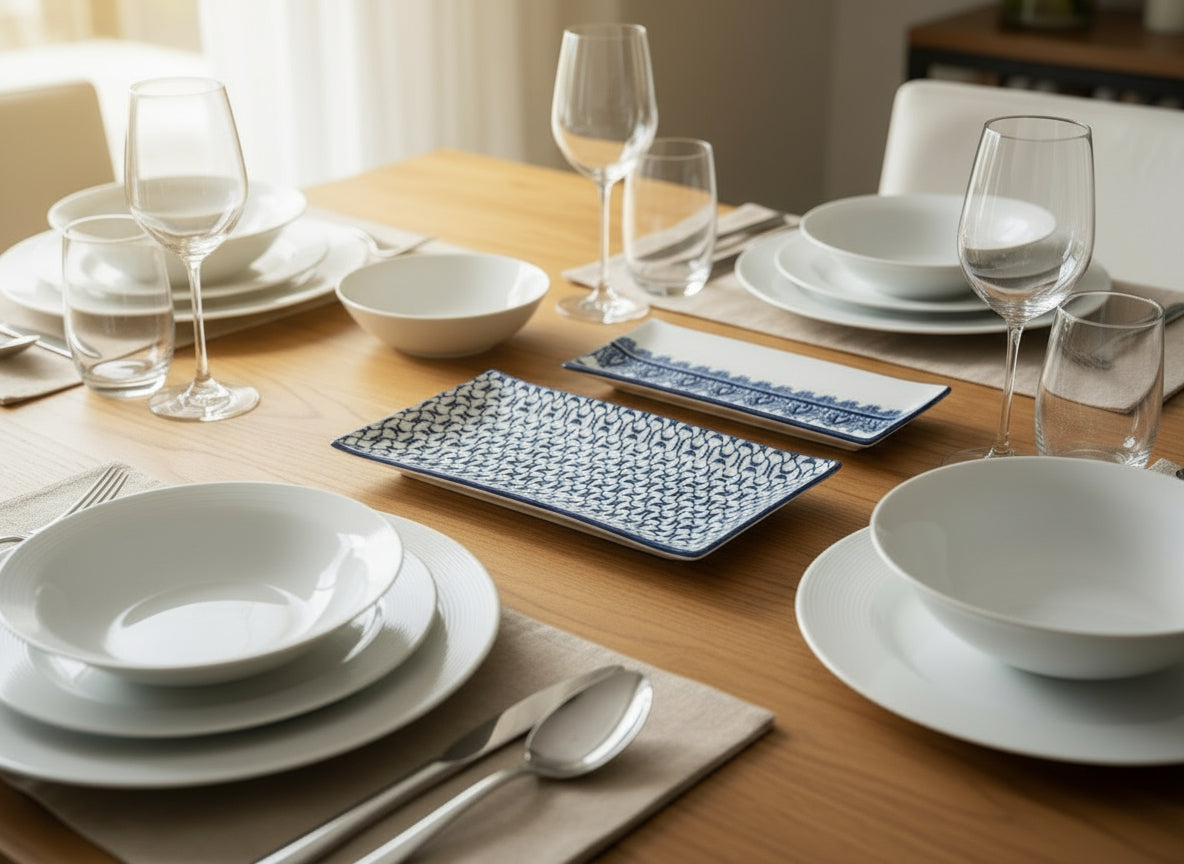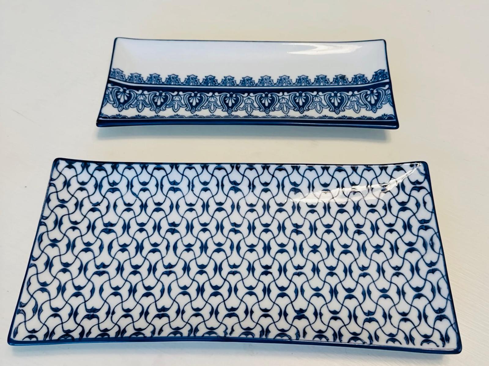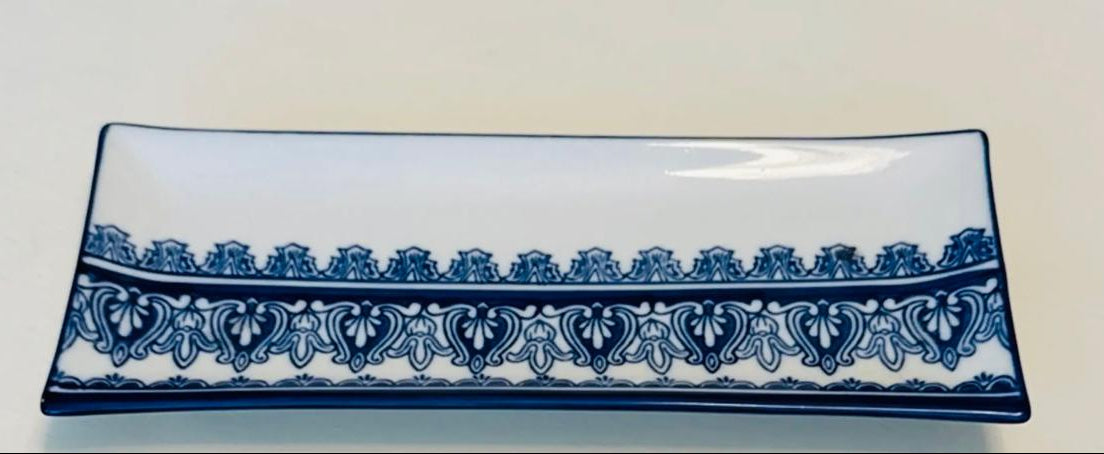 Azafate rectangular de porcelana Bombay, diseño azul sobre blanco con borde ornamental. Ideal para servir quesos, charcutería o postres con elegancia vintage.