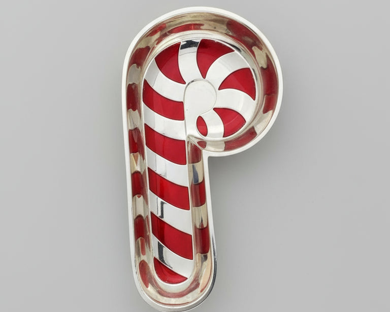 Bandeja de con diseño navideño en forma de bastón de caramelo. Franjas diagonales rojas y plateadas con remate en espiral. Perfecta para servir dulces, decorar mesas festivas o como pieza de colección tematica.