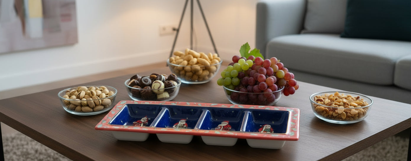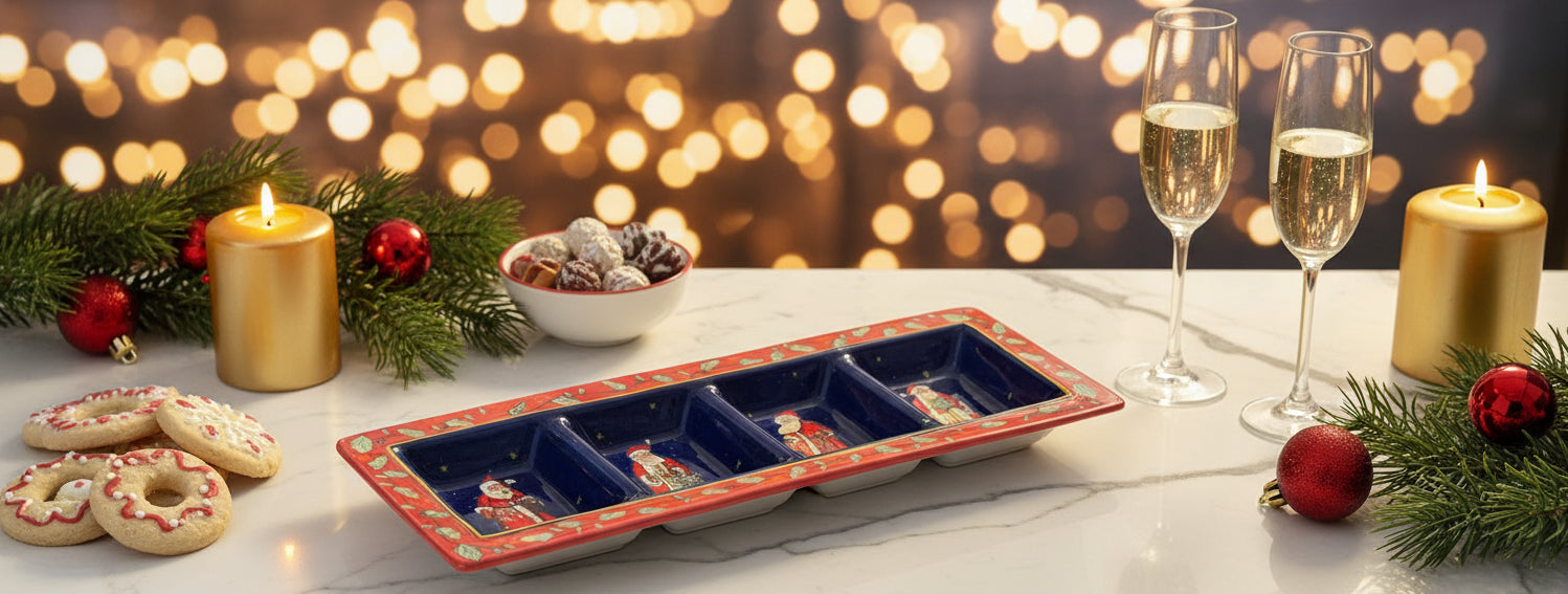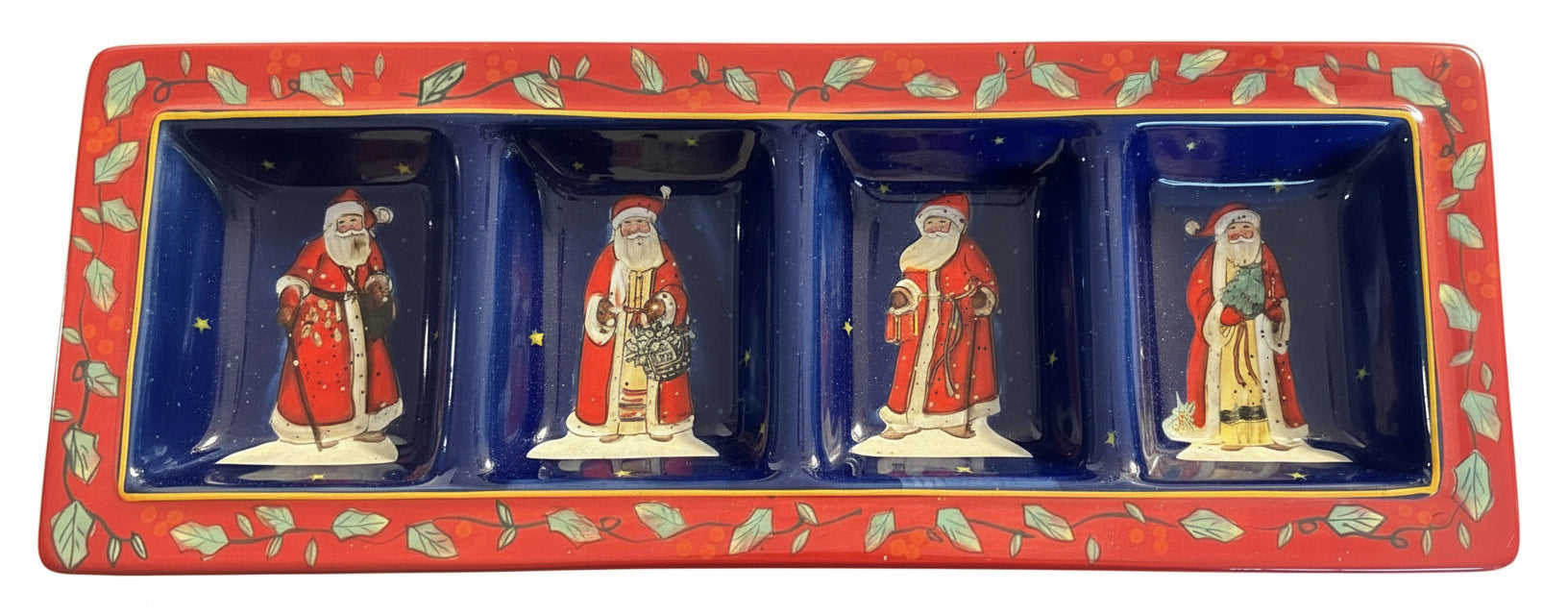 Elegante bandeja de servir de cerámica con cuatro secciones, diseñada por Sango como parte de la colección "Christmastime in the City". Su diseño permite organizar diferentes alimentos de manera práctica y atractiva.
