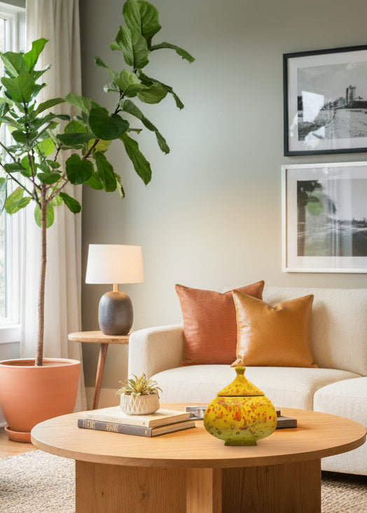 Pieza de cerámica artesanal de los años 70 con acabado splatterware en verde lima, naranja y rosa. Su forma bulbosa redondeada y tapa con tirador puntiagudo la hacen ideal para almacenar especias, café o azúcar. Decoración MCM auténtica que añade carácter retro a cualquier cocina.