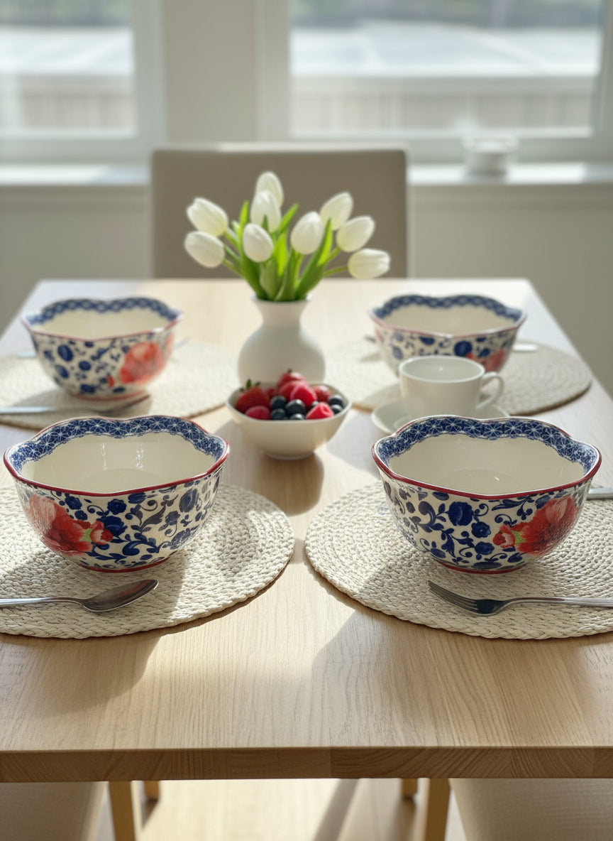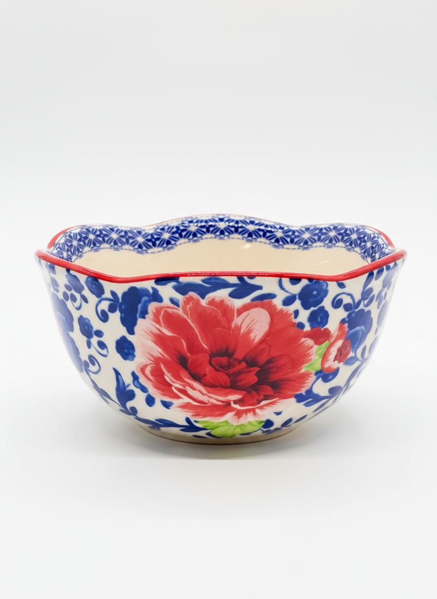 Diseño clásico azul y blanco con acentos florales en rojo y rosa, y borde ondulado rojo oscuro. Mide 6 pulgadas de diámetro y 3 pulgadas de alto, perfecto para cereal o sopa. Seguro para lavar en lavavajillas y microondas. Parte de la colección Heritage Floral de The Pioneer Woman, ideal para mezclar y combinar.