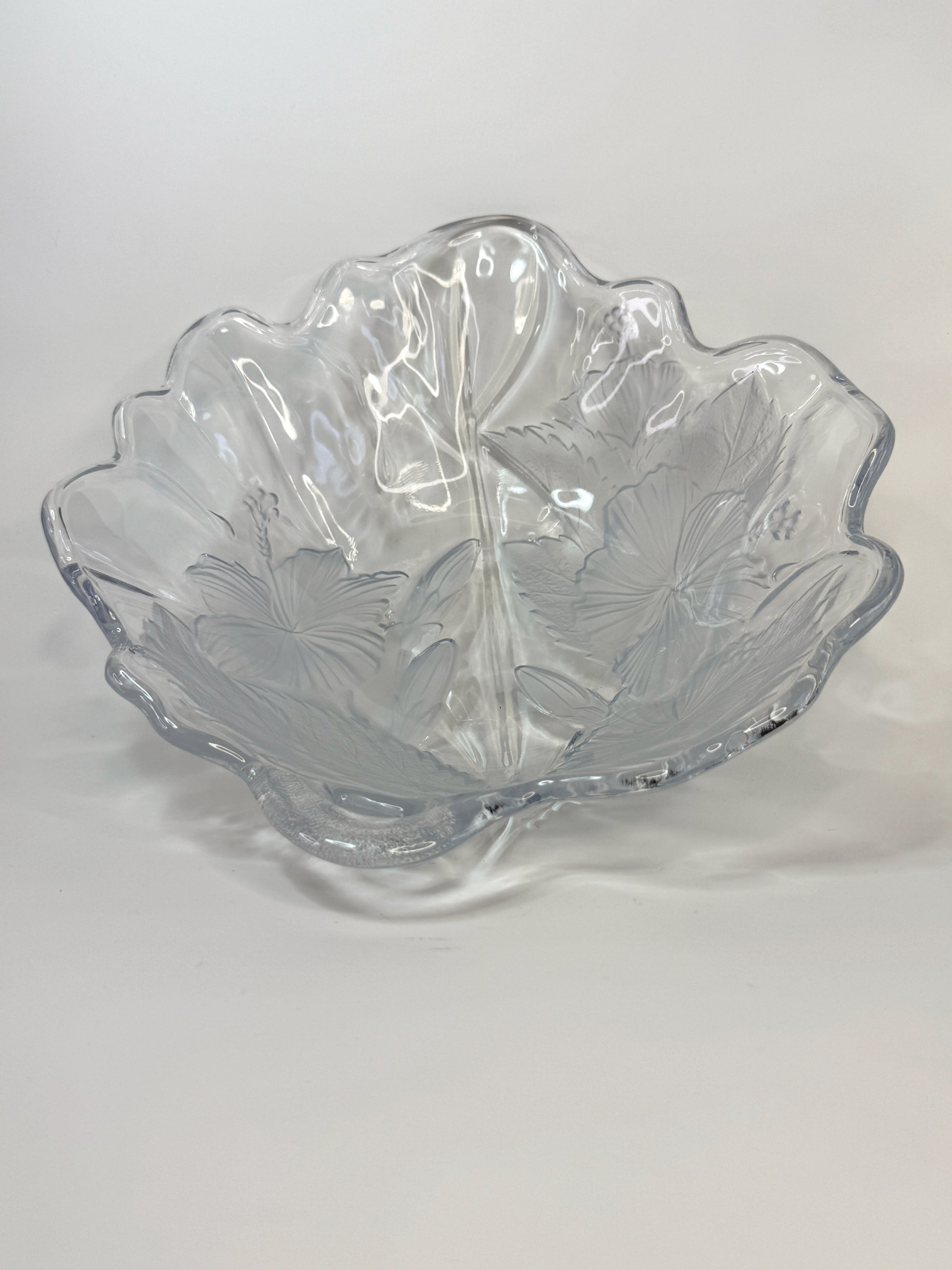 Este bowl de vidrio transparente presenta un diseño en forma de flor con bordes ondulados y grabados de hibiscos en relieve, que aportan un aire tropical y sofisticado. Su acabado brillante y su forma artística lo convierten en un elemento central perfecto para cualquier mesa o vitrina.