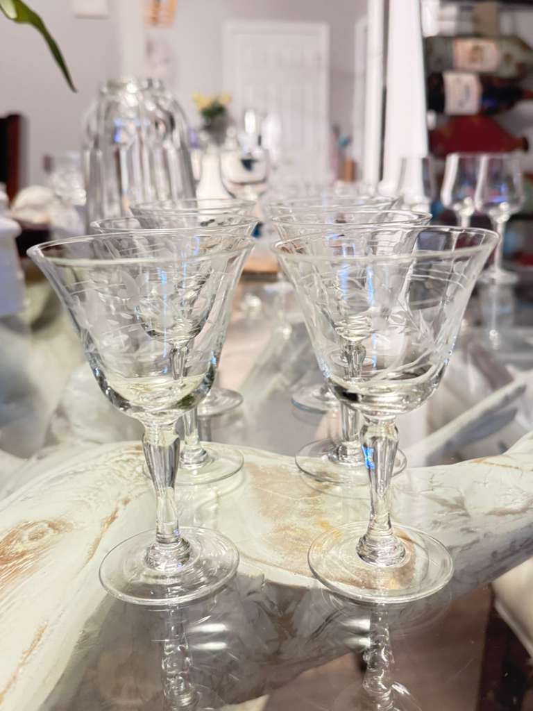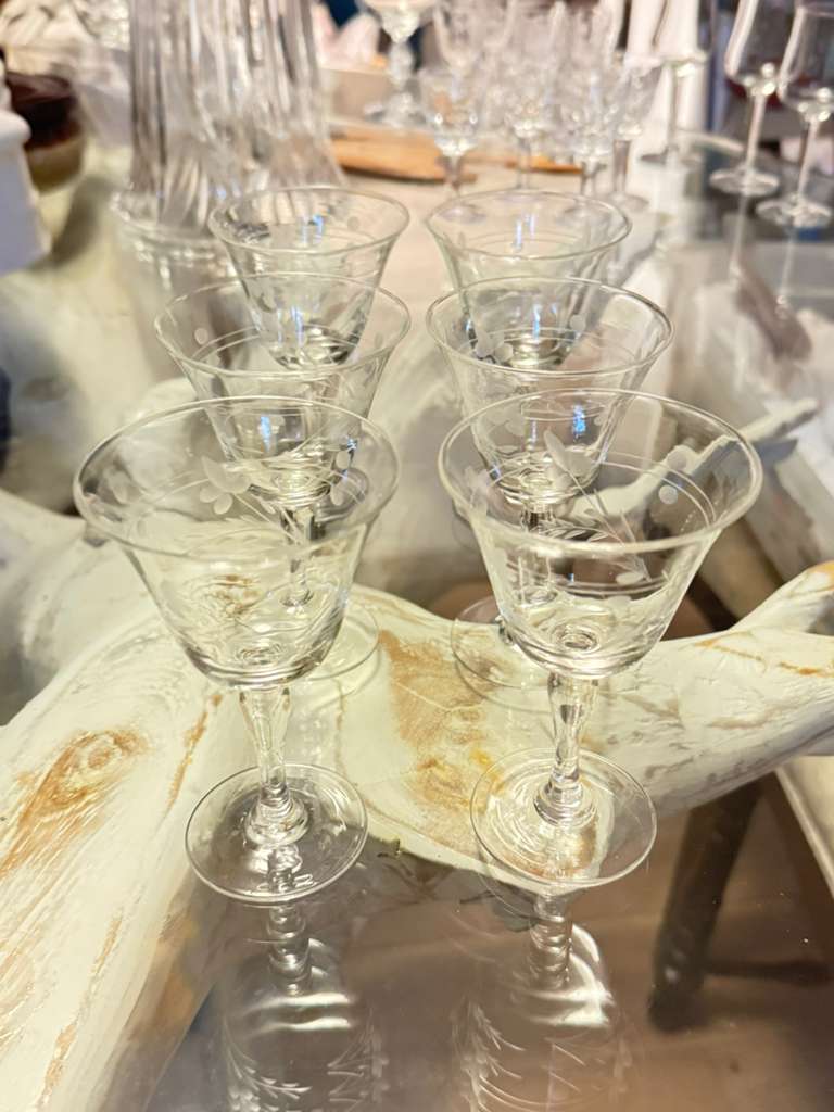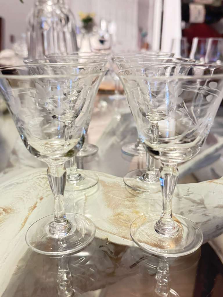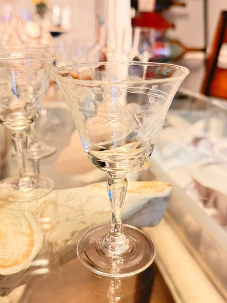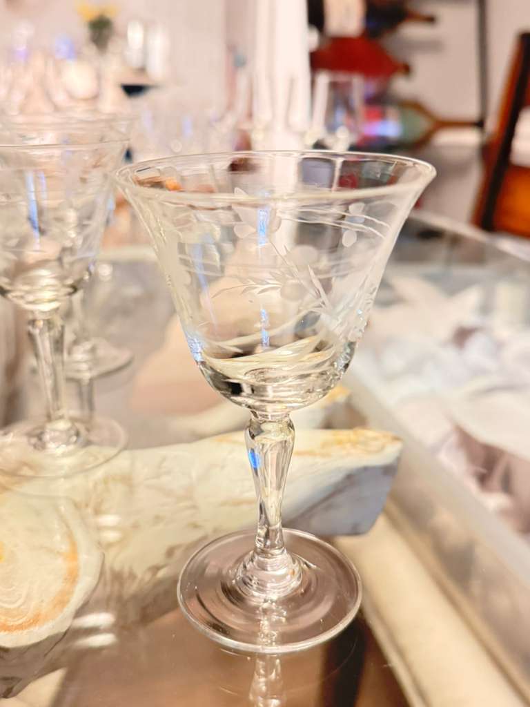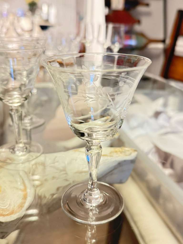 Exquisita copa cordial del patrón Willow Moon, fabricada en Japón durante la era de ocupación (1945–1951). Presenta grabado al ácido con delicados motivos florales y hojas, tallo elegante y borde abierto. Perfecta para aperitivos, licores o cócteles. Pieza coleccionable de cristalería vintage de mediados del siglo XX, ideal para vitrinas o cenas especiales.