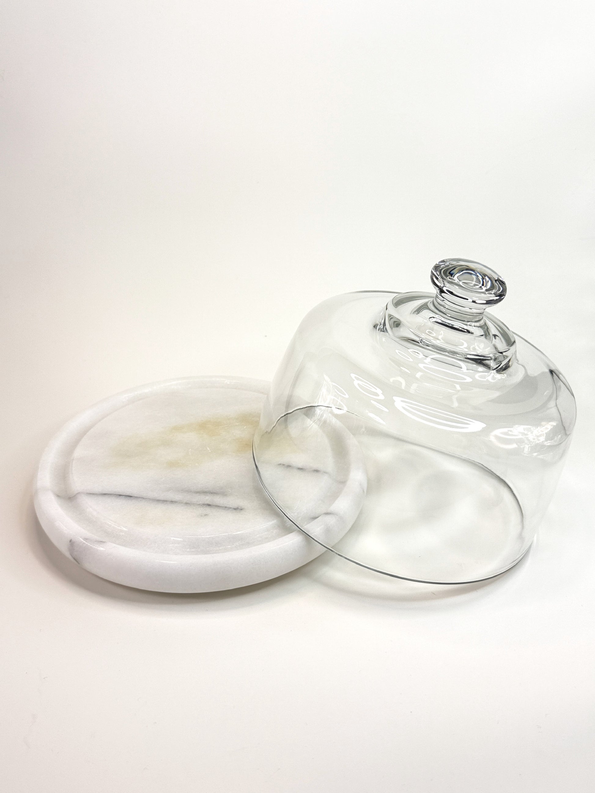 Este conjunto de cúpula transparente y base de mármol blanco celebra el arte de presentar con gracia. Su diseño limpio y materiales nobles lo convierten en una pieza versátil, ideal para quesos, postres o pequeños bocados que merecen ser destacados.
