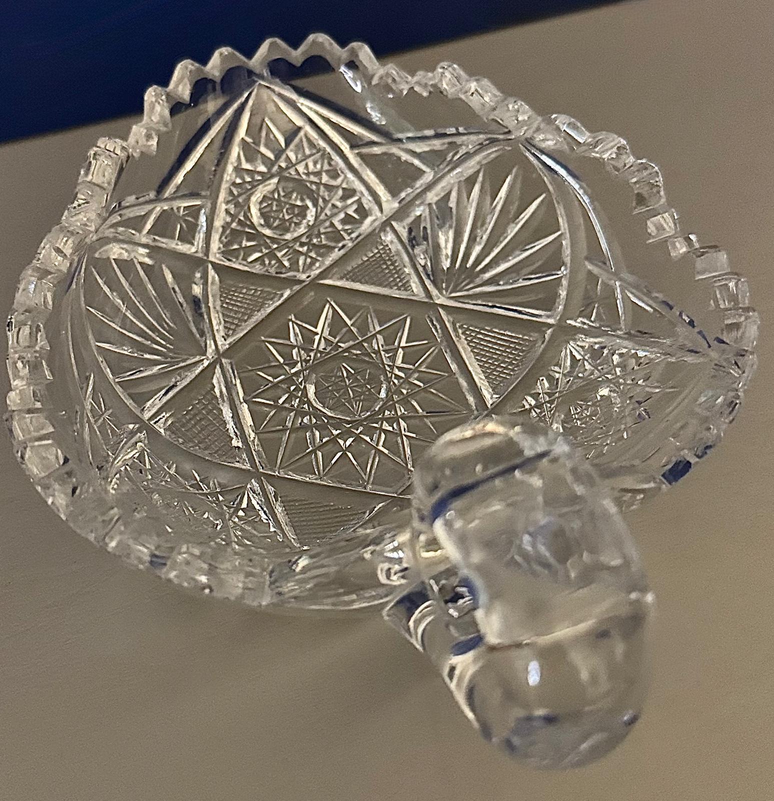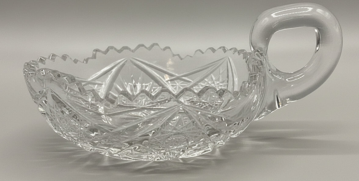 Pieza de cristal tallado estilo American Brilliant Cut con motivos de estrellas, diamantes y abanicos. Mide 3" de alto x 5 3/4" de ancho, cuenta con asa robusta y borde festoneado. Ideal para servir condimentos o como acento decorativo. Artesanía americana de finales del siglo XIX, coleccionable y de alto valor estético.