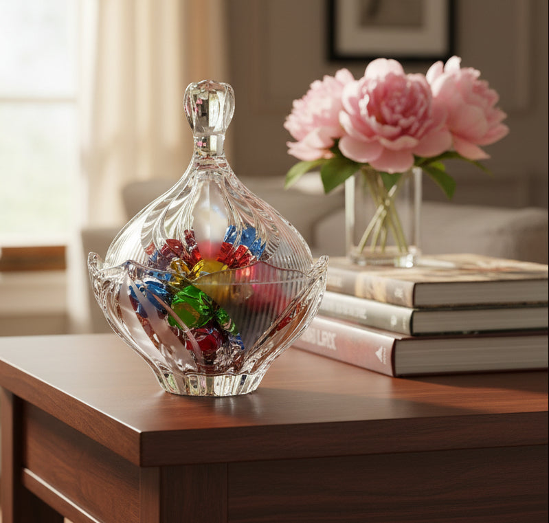 Elegante dulcera alemana de cristal con 24% de plomo, fabricada entre 1950–1970. Diseño esmerilado en forma de pétalos con juego de luz y texturas. Perfecta para servir dulces, galletas o como pieza decorativa en vitrinas y mesas de café. Cristal de alta calidad que combina funcionalidad y elegancia vintage.