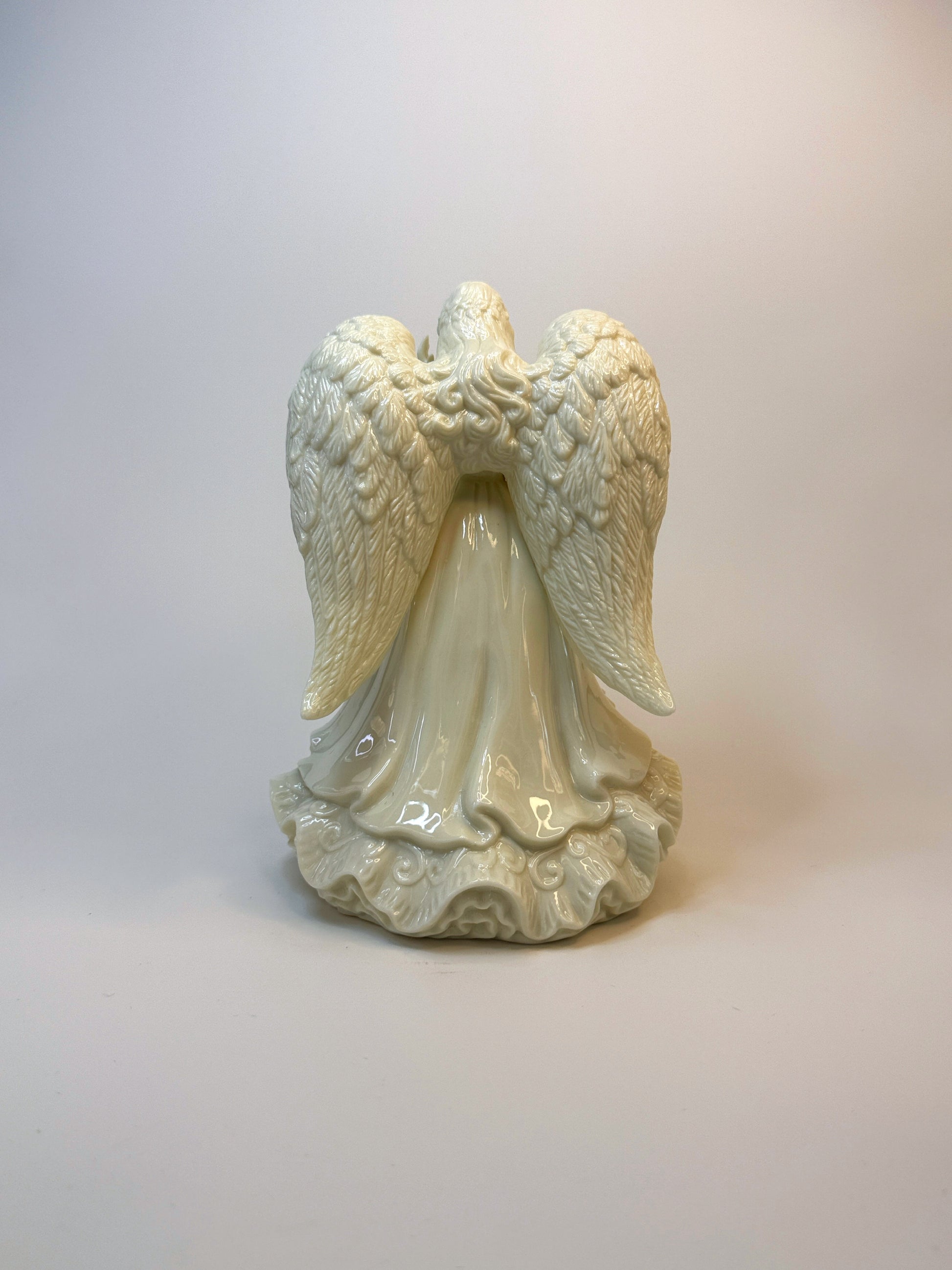 Este ángel de cerámica blanca, con alas detalladas y un gesto sereno, sostiene una vela en sus manos como símbolo de luz y esperanza. Los adornos dorados en la túnica realzan su belleza, aportando un toque de distinción y espiritualidad atemporal.
