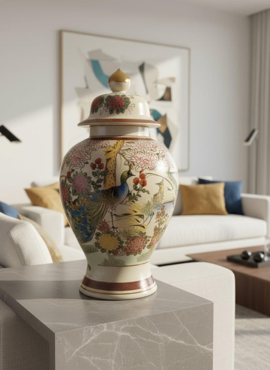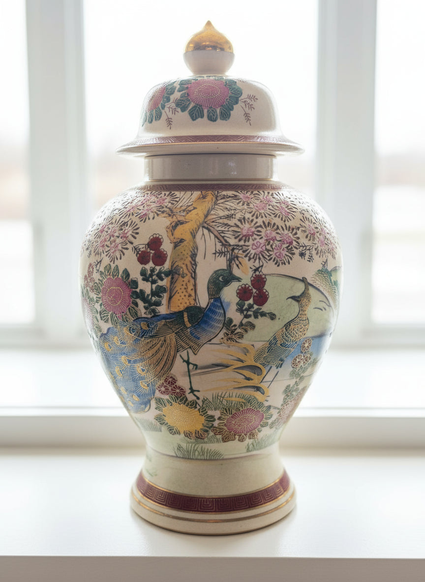 Jarrón decorativo con tapa, diseño de pavos reales y flores sobre base marfil craquelada con detalles dorados. Ideal para ambientar con elegancia oriental y coleccionismo vintage.