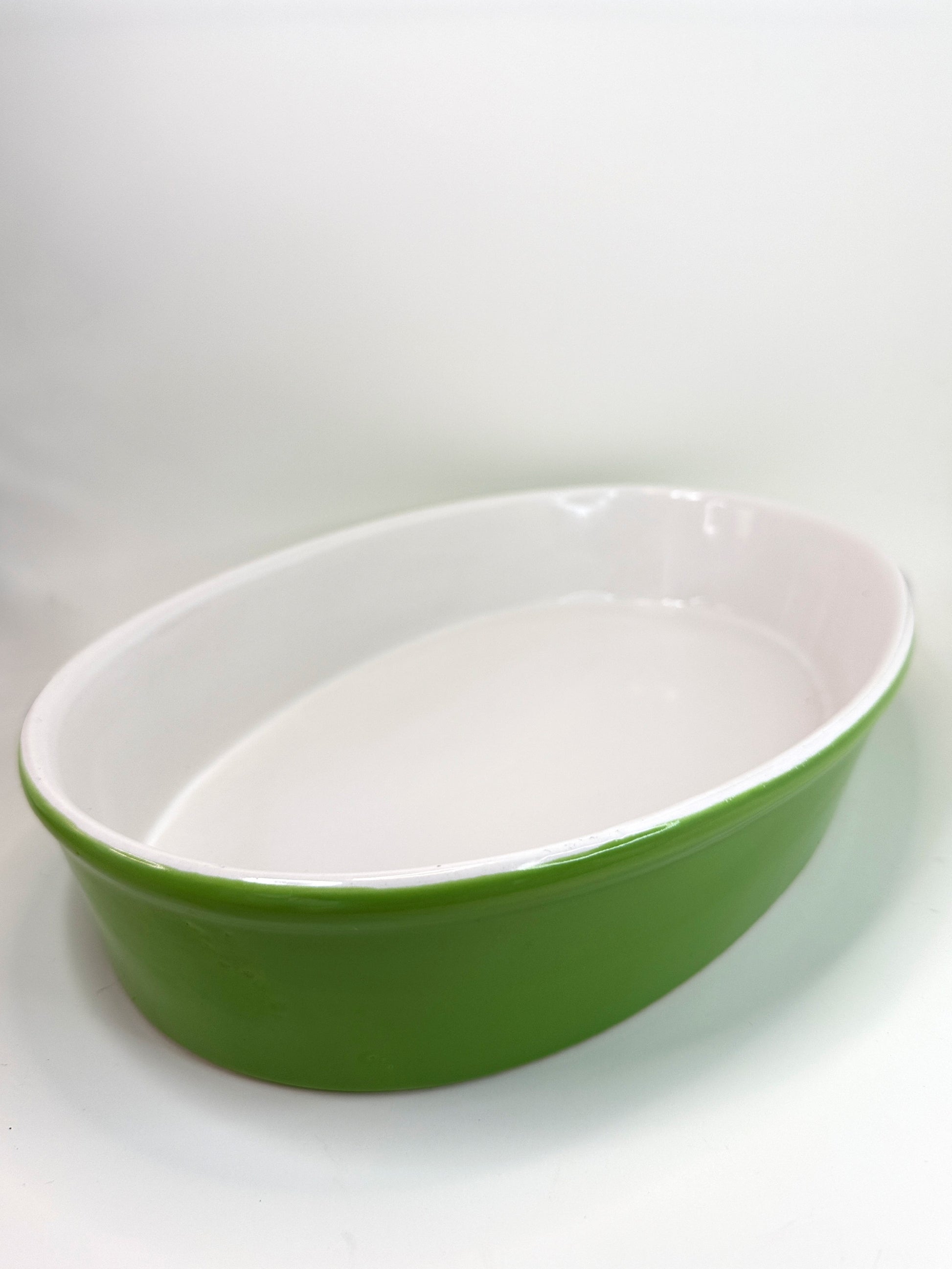 Esta fuente de cerámica ovalada, con interior blanco radiante y exterior verde manzana, evoca la sencillez de una cocina bien cuidada. Su diseño limpio y colores frescos la convierten en una pieza versátil, ideal para hornear, servir y embellecer cualquier mesa.