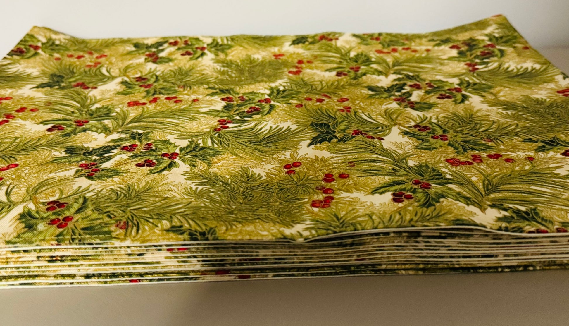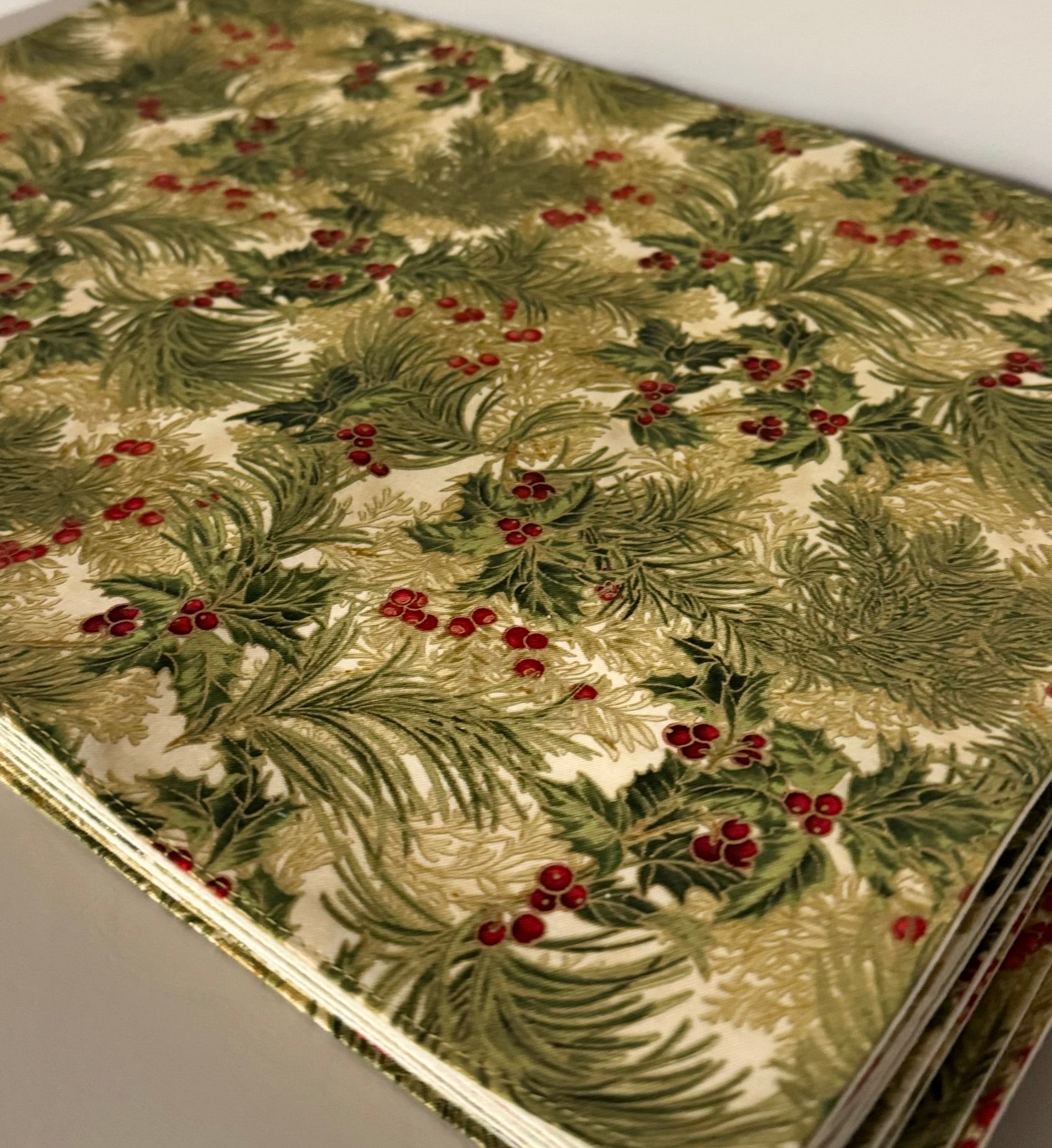Aporta un aire festivo y elegante a tu mesa con este individual de tela de inspiración navideña. Su diseño presenta ramas de pino en tonos verdes y delicados racimos de bayas rojas sobre un fondo crema, creando un contraste cálido y sofisticado.