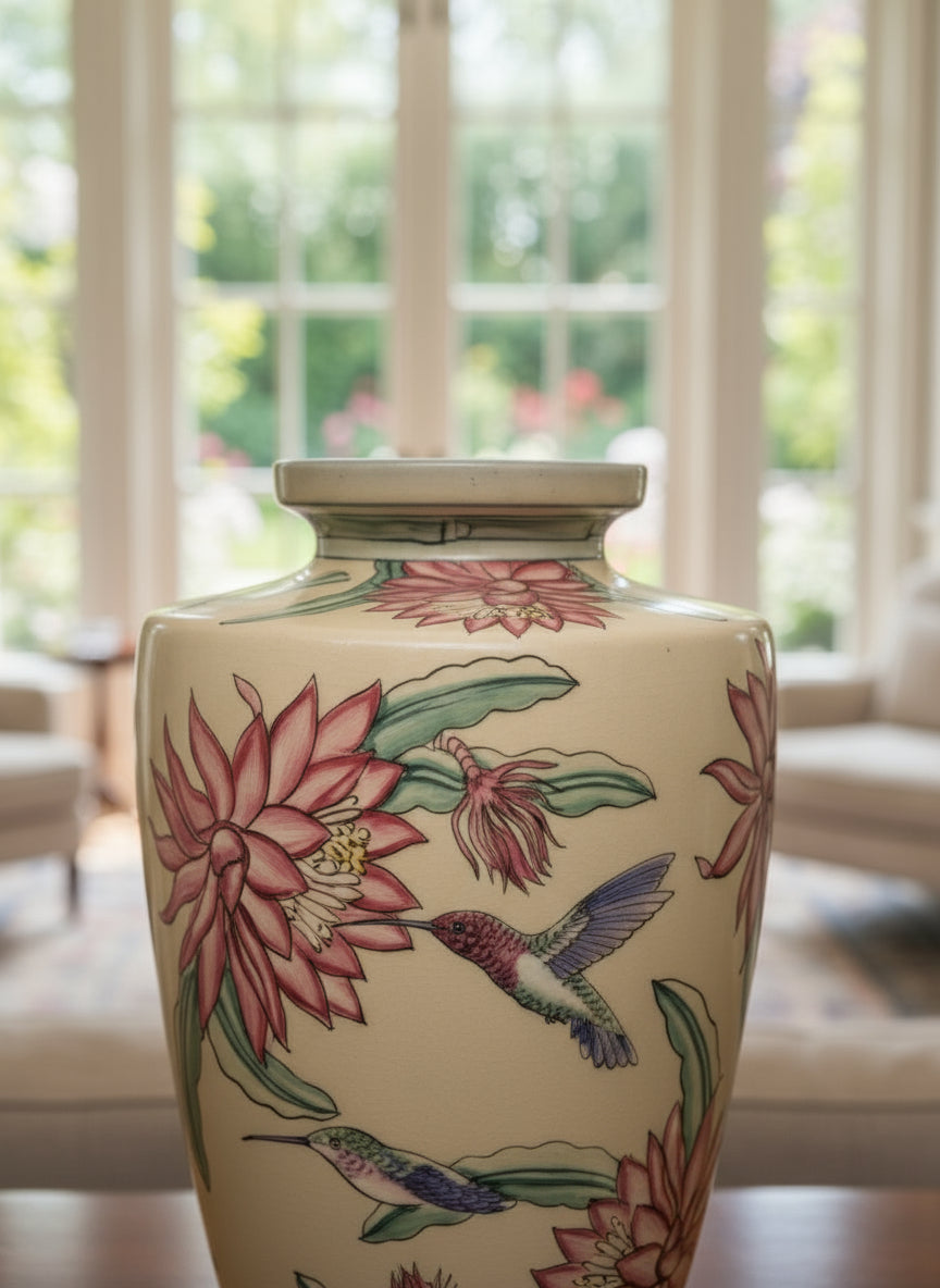 Jarrón decorativo en cerámica beige con ilustraciones vibrantes de colibríes y flores. Parte de la colección “Hummingbird Collection”. Incluye sello “Made with Love”.