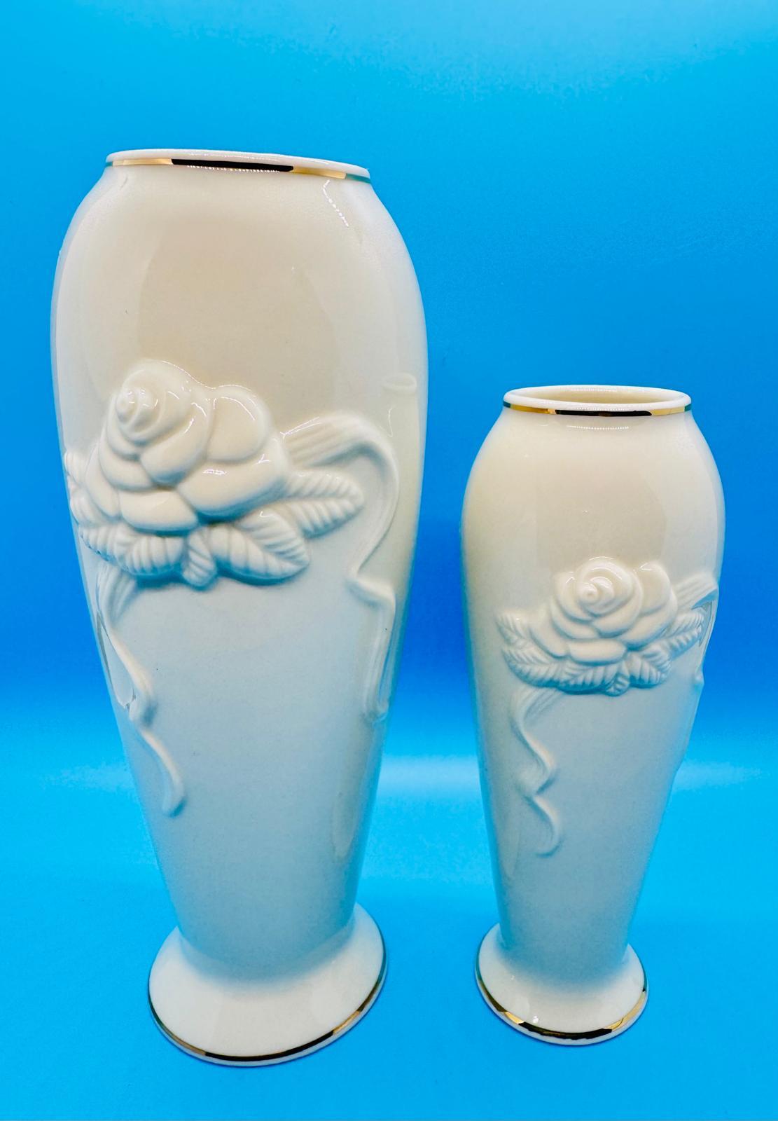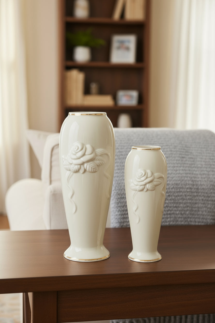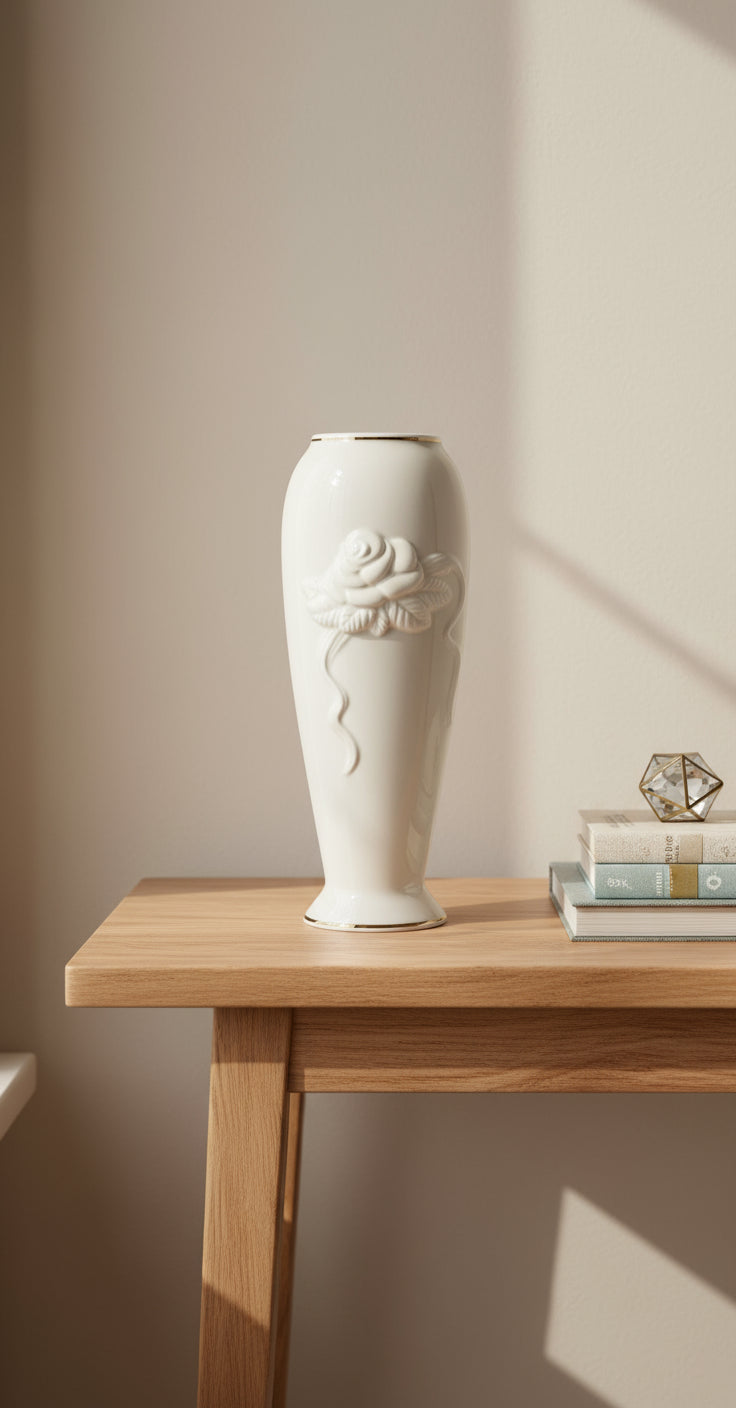 Jarrón de porcelana color ivory Lenox, hecho a mano en Malasia (año 2000). Relieve de rosa en acabado brillante. Ideal para arreglos florales o decoración atemporal.