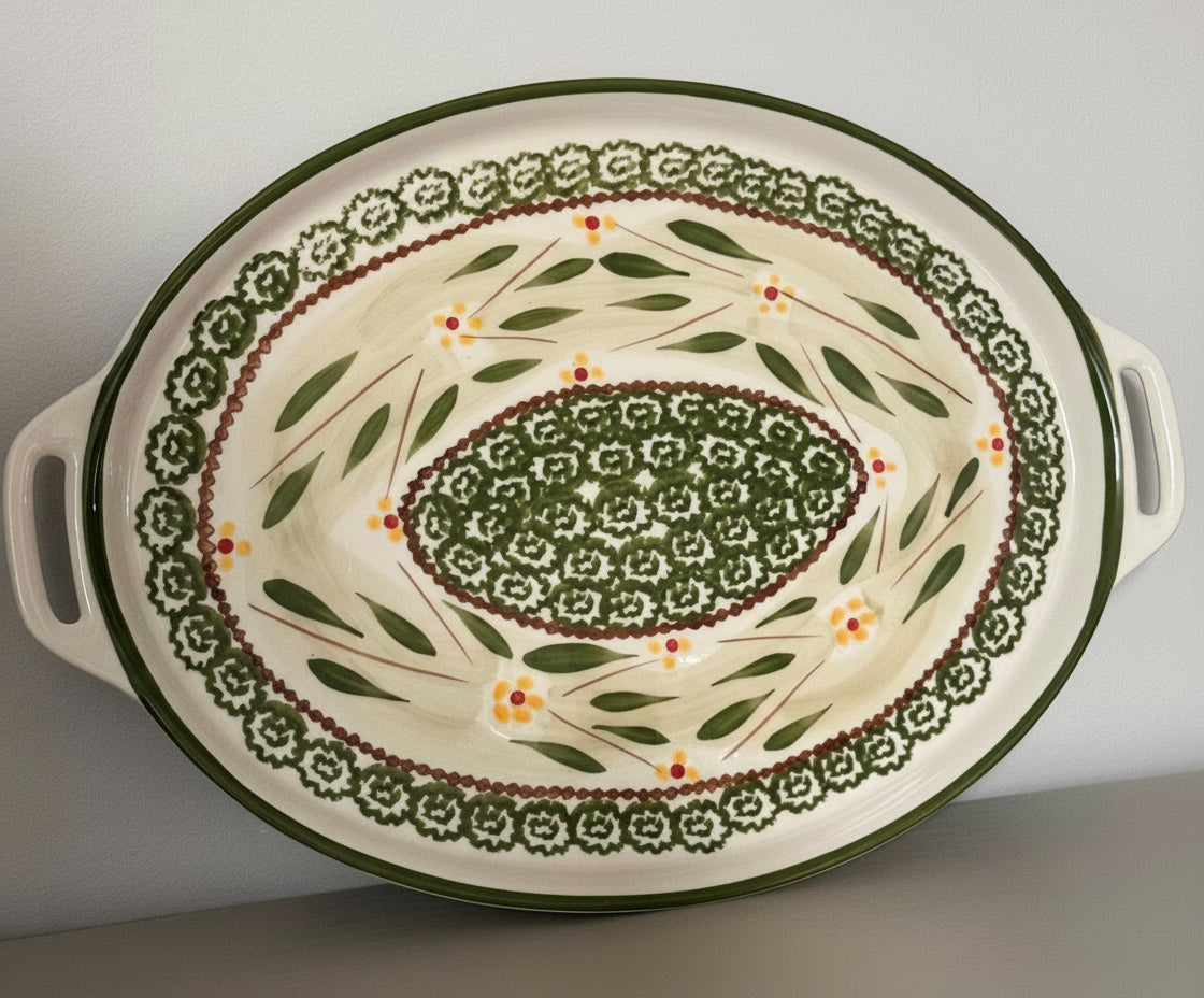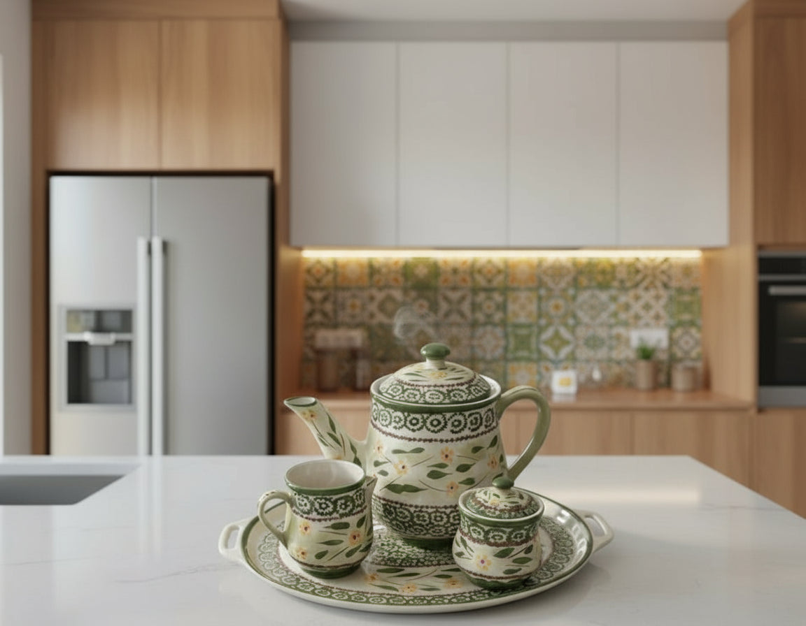 Este encantador conjunto de té, compuesto por tetera, taza, azucarera con tapa y bandeja ovalada, celebra la belleza de lo artesanal. Cada pieza está decorada con motivos florales pintados a mano en tonos verdes, amarillos y rojos sobre fondo blanco, evocando jardines antiguos y sobremesas llenas de historia.