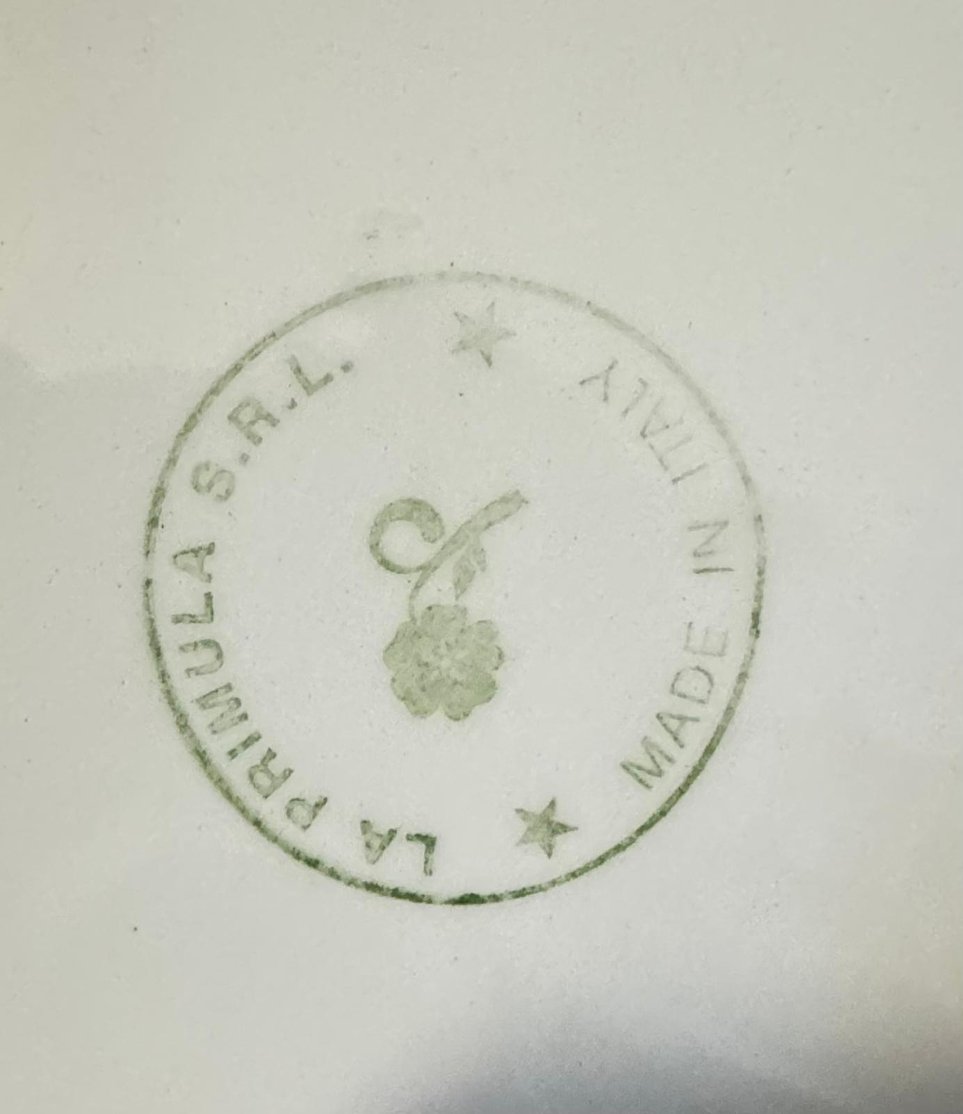 Plato de cerámica italiana con diseño de franjas rojas y verdes. Hecho en Italia. Ideal para servir con encanto artesanal.
