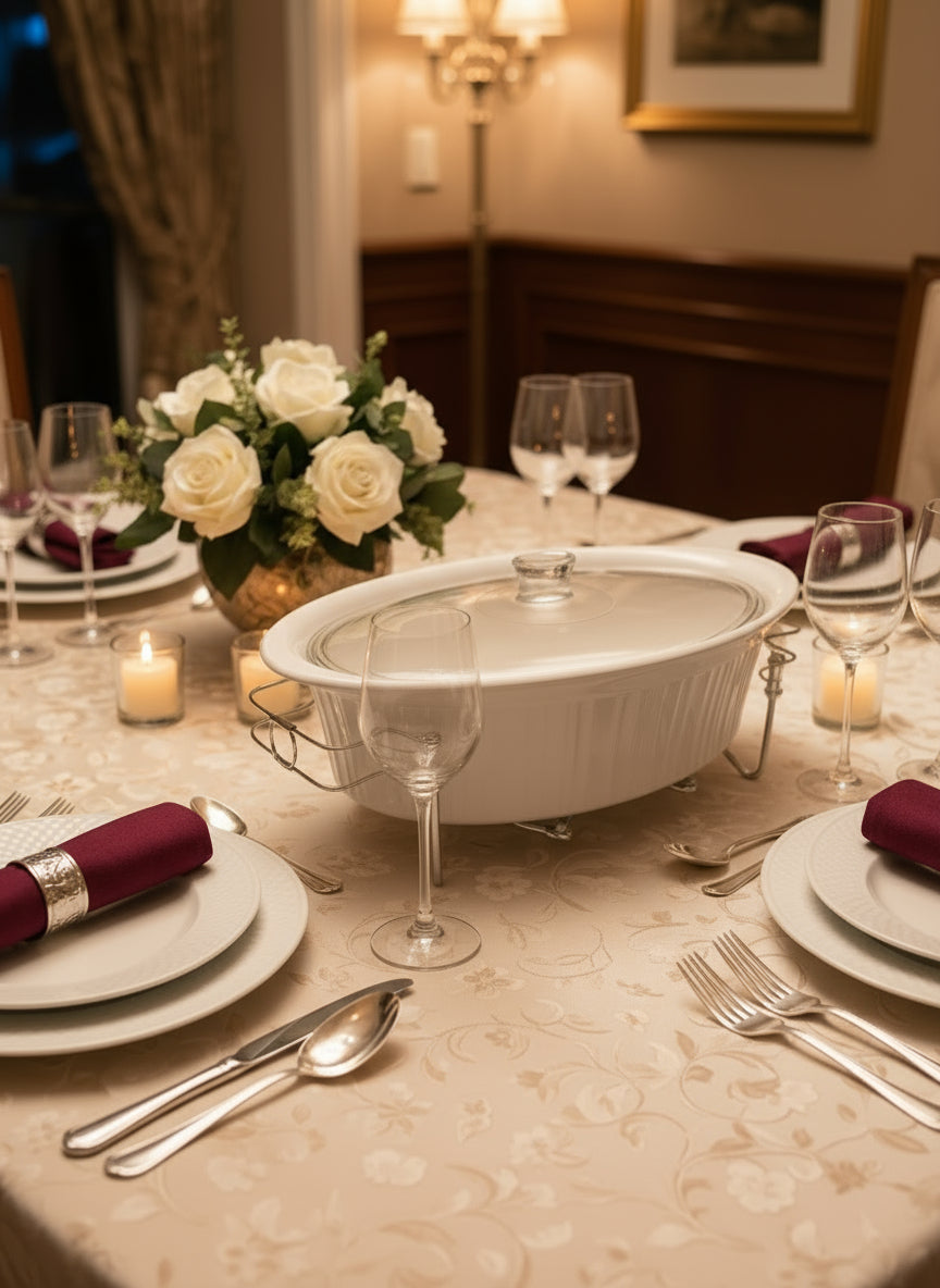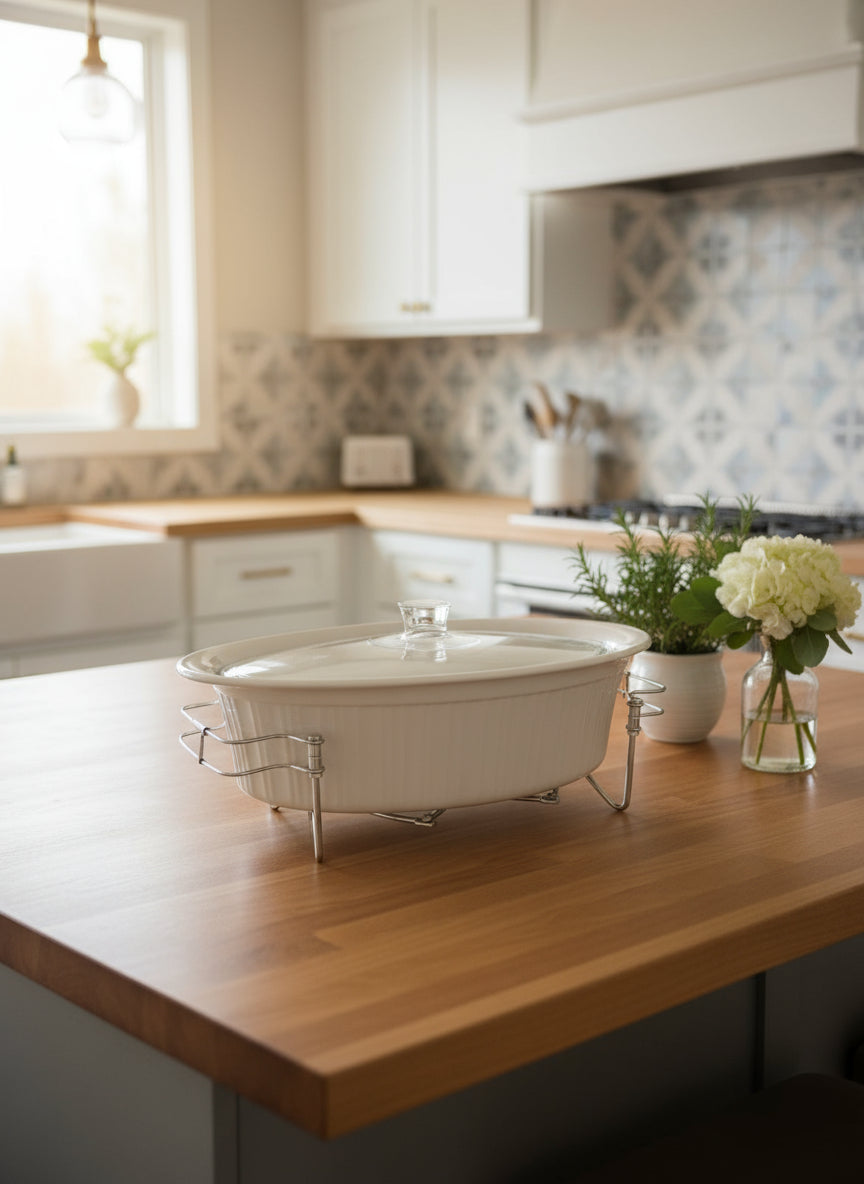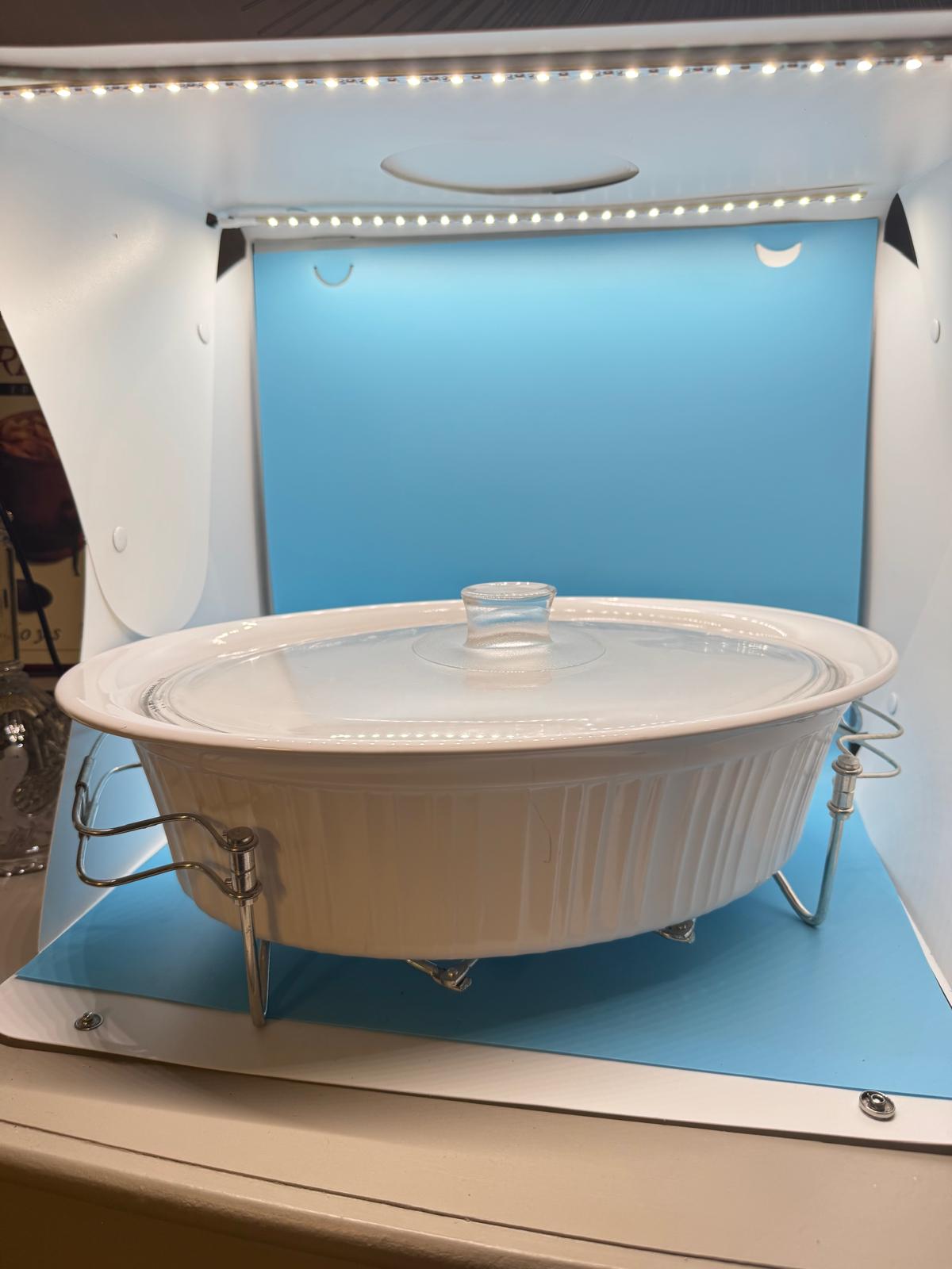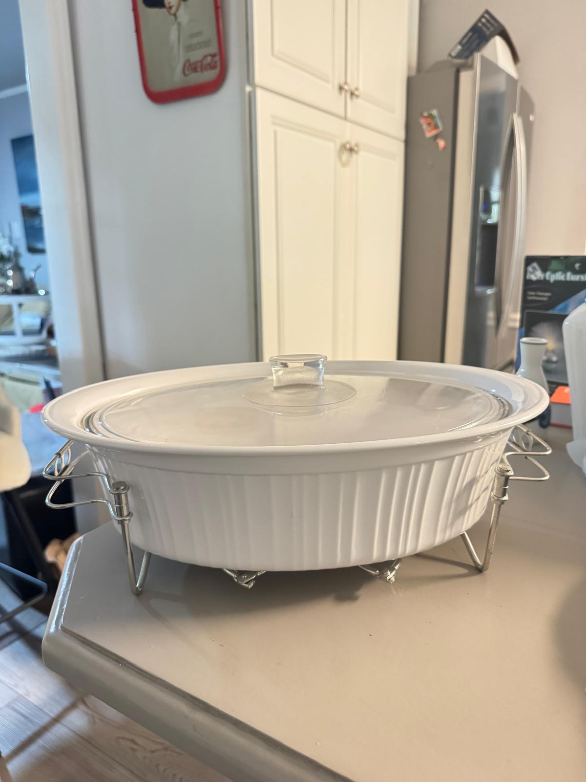 Cazuela de stoneware duradero con tapa de vidrio templado y base metálica. Ideal para hornear, servir y conservar. Estado: Vintage funcional.