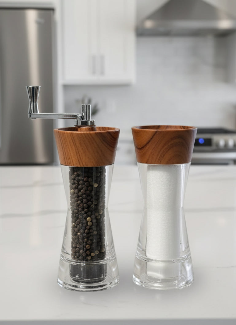 Molinos vintage con cuerpo transparente y diseño madera. La manivela superior activa un mecanismo cerámico que tritura especias frescas al instante. Perfectos para cocina diaria o como regalo elegante.