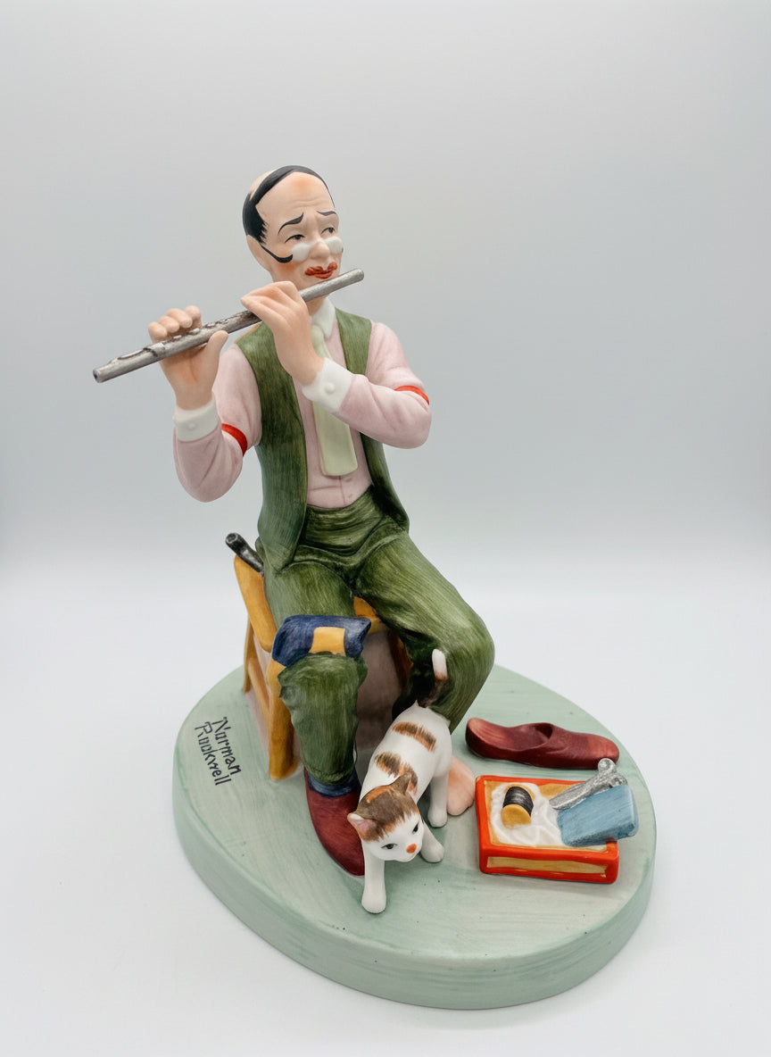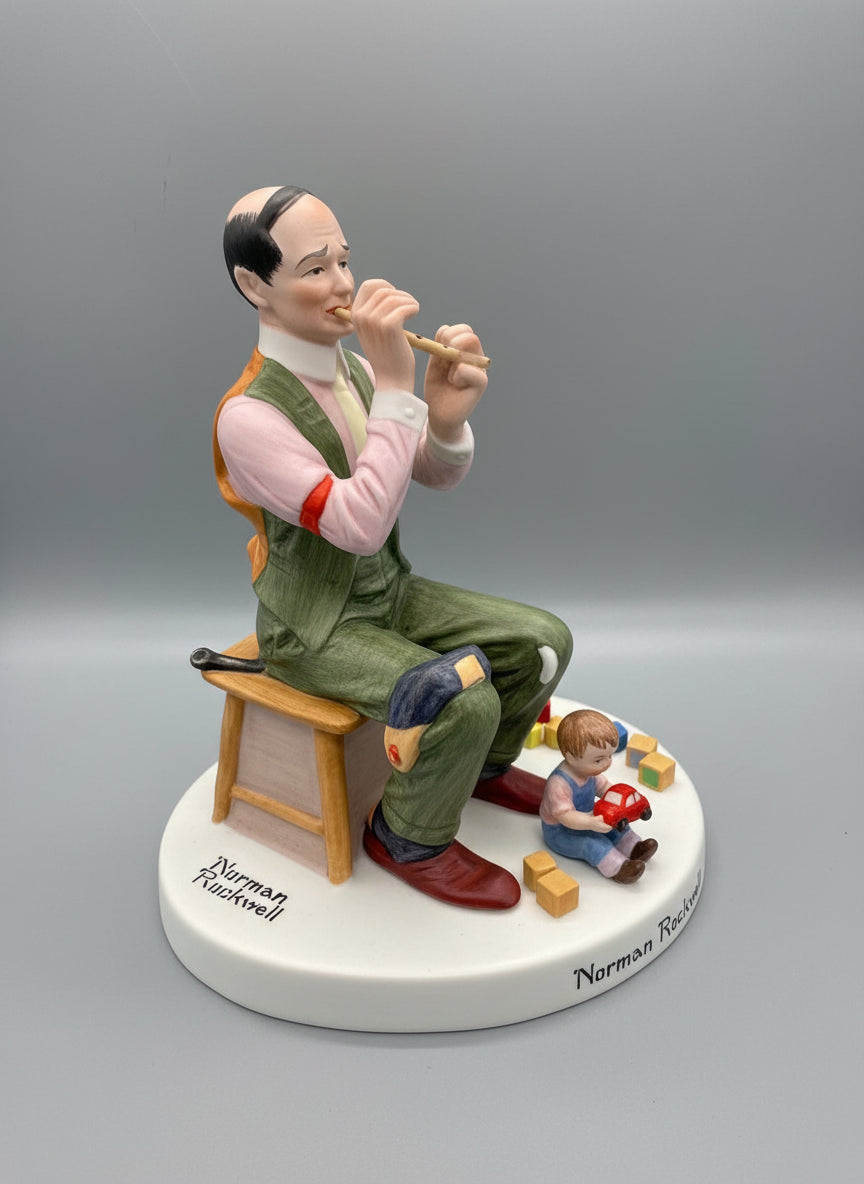 La figura de porcelana de Norman Rockwell que se muestra se llama "Man Threading a Needle" (Hombre enhebrando una aguja). Forma parte de una colección de doce figuras de porcelana producidas en 1980 por The Danbury Mint, y muestra a un hombre sentado con un gato a sus pies.