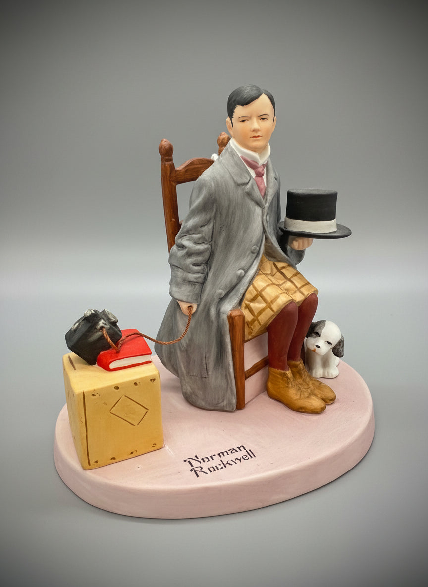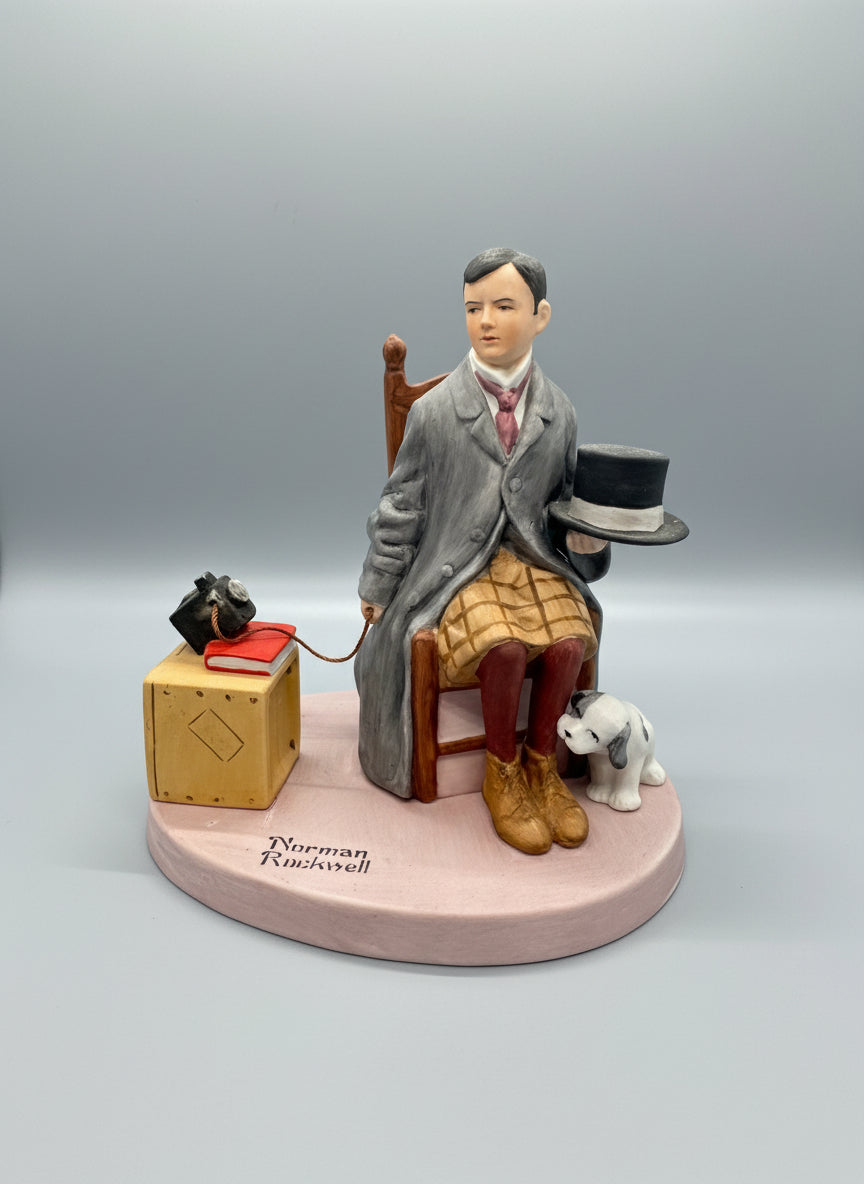 La figura se llama "Self-Portrait" (Autorretrato). Es una figura de porcelana de Norman Rockwell producida en 1980 por The Danbury Mint. Forma parte de una colección de doce figuras y representa al propio artista sentado, sosteniendo un sombrero de copa y con un pequeño perro a sus pies, junto a una maleta donde se encuentran su cámara y un libro.
