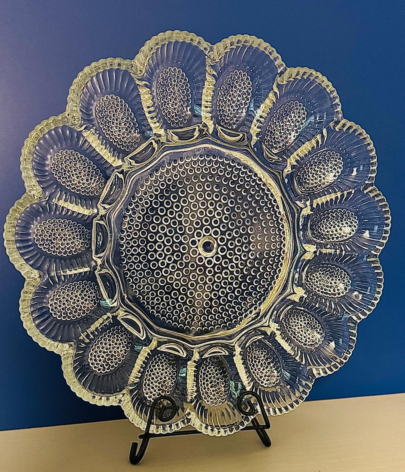 Bandeja de cristal prensado de 11 pulgadas fabricada por Indiana Glass Company entre 1950 y 1970. Diseñada para servir huevos rellenos con 12-15 compartimientos individuales y sección central para acompañamientos. Bordes festoneados y patrones decorativos en hobnail u ondas tipo abanico. Pieza coleccionable versátil para brunches, celebraciones o exhibición decorativa.