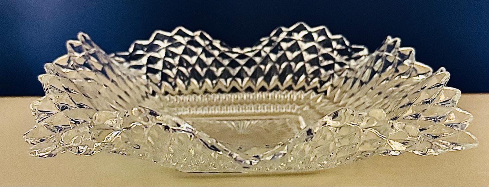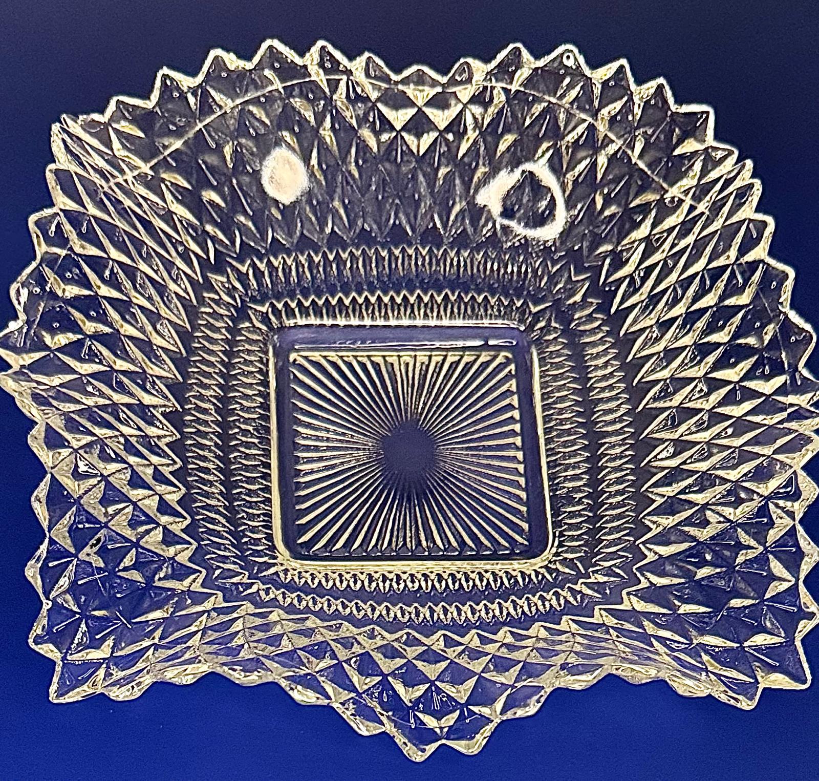 Dulcera Vintage Federal Glass "Traditions" Pieza de cristal prensado de los años 1930 con textura diamante y patrón starburst radial. Perfecta para servir dulces, nueces o bombones, combina funcionalidad con elegancia decorativa. Ideal como acento en mesas de centro o vitrinas. Representa la estética clásica de la cristalería americana vintage.