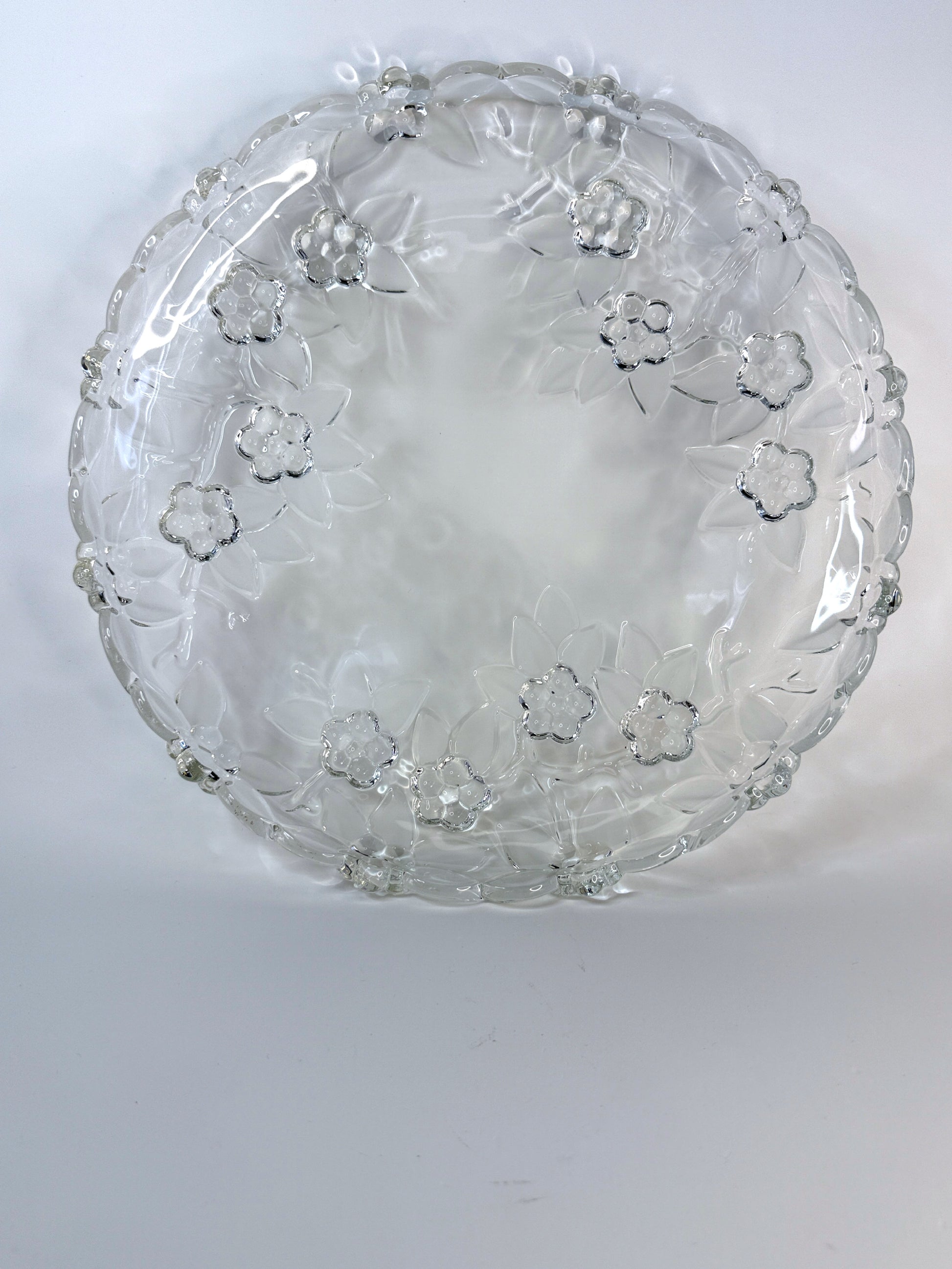 Dale un aire refinado y atemporal a tu mesa o vitrina con este plato de vidrio transparente, finamente trabajado con un diseño en relieve de flores y hojas. Su borde decorado con motivos florales en relieve y acabado brillante lo convierten en una pieza única, ideal tanto para uso decorativo como para coleccionistas de cristalería vintage.