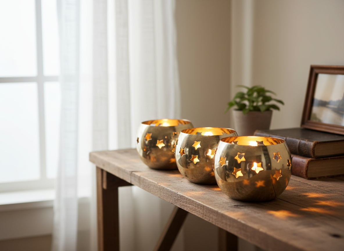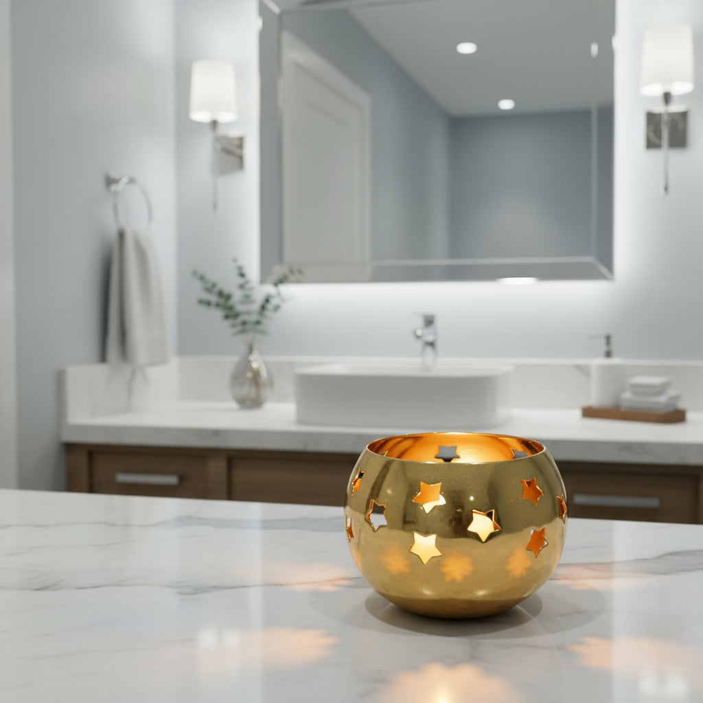 Portavelas dorado vintage con diseño celestial perforado en forma de estrellas. Ideal para crear reflejos cálidos en repisas o mesas.