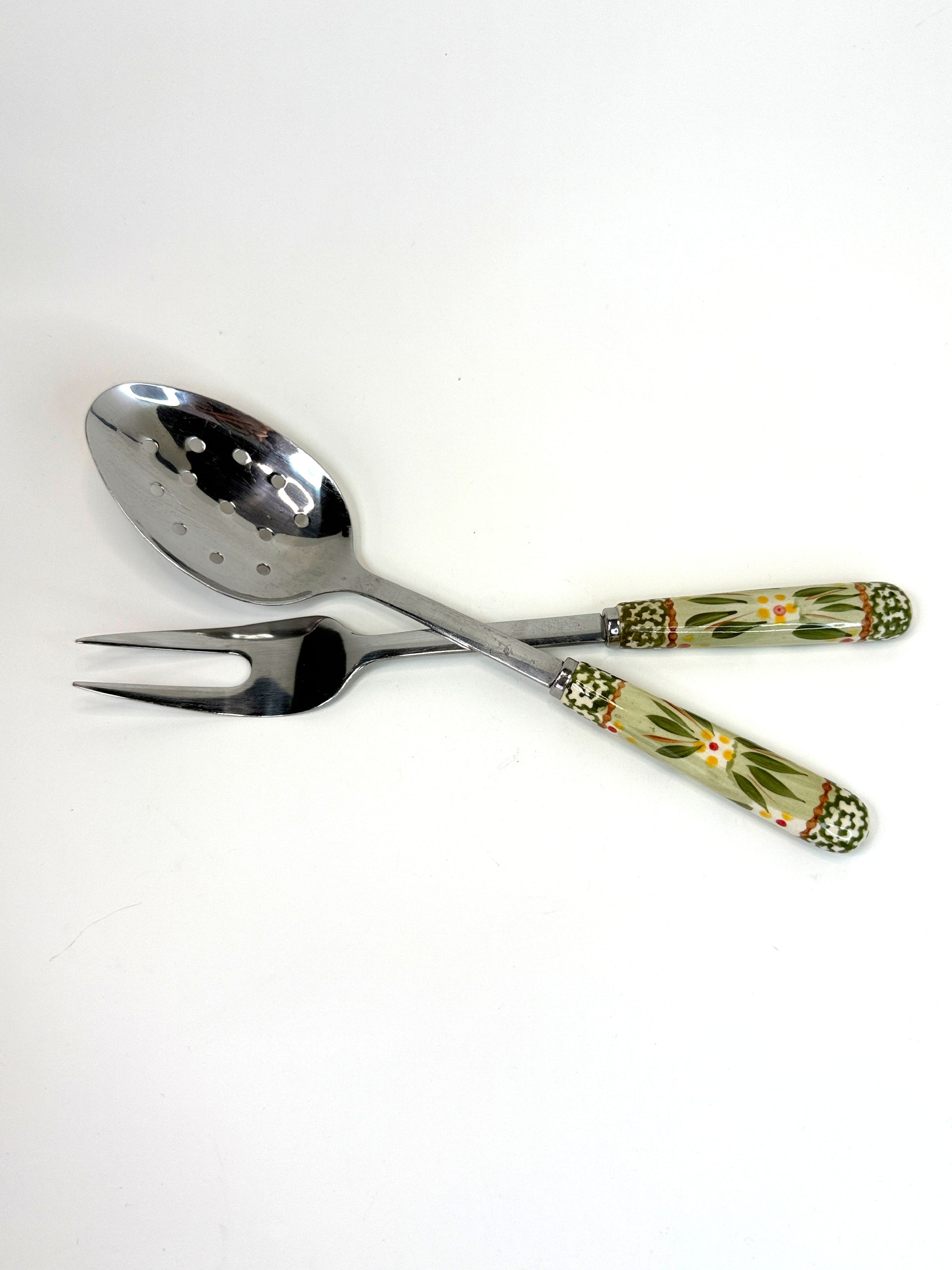Este conjunto de cuchara perforada y tenedor para servir eleva el ritual de la mesa con un toque de calidez artesanal. Sus mangos, adornados con un delicado trabajo de decoupage floral, invitan a disfrutar de las comidas cotidianas como actos de cariño y celebración.