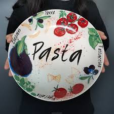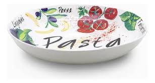 Tazón de cerámica de 8 pulgadas con diseño italiano que celebra la gastronomía. Presenta ilustraciones vibrantes de vegetales frescos y nombres de pastas como Penne, Linguine, Fettuccine y Farfalle alrededor del borde. Material duradero, apto para microondas y lavavajillas. Perfecto para servir pasta o ensaladas con estilo.