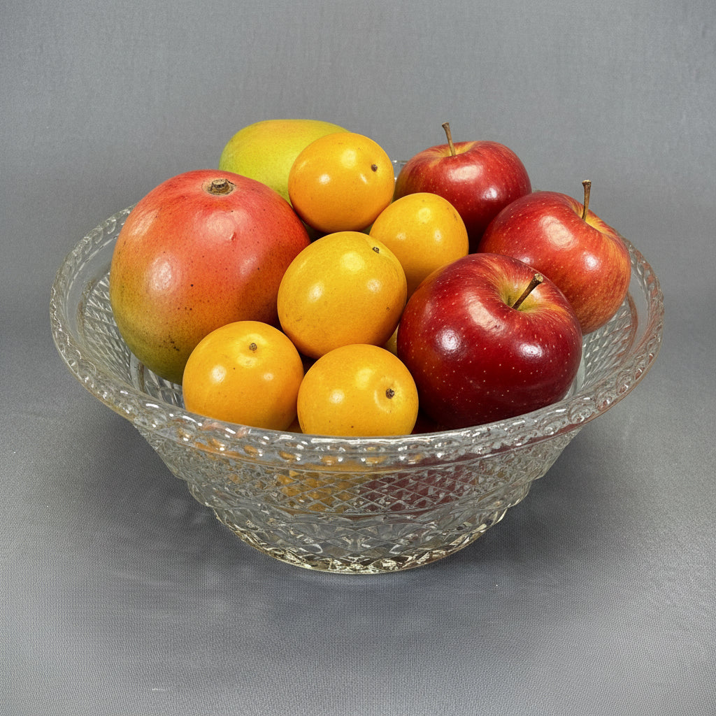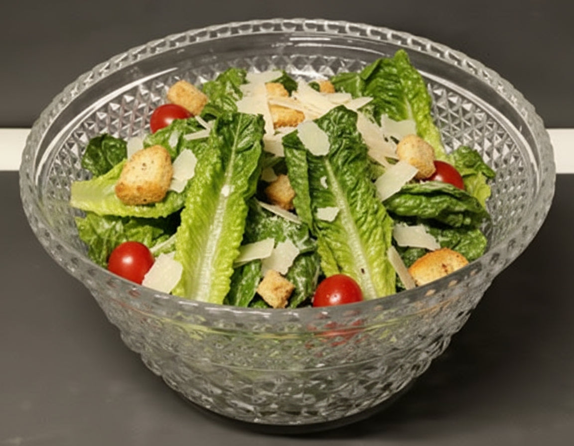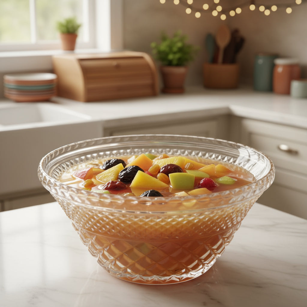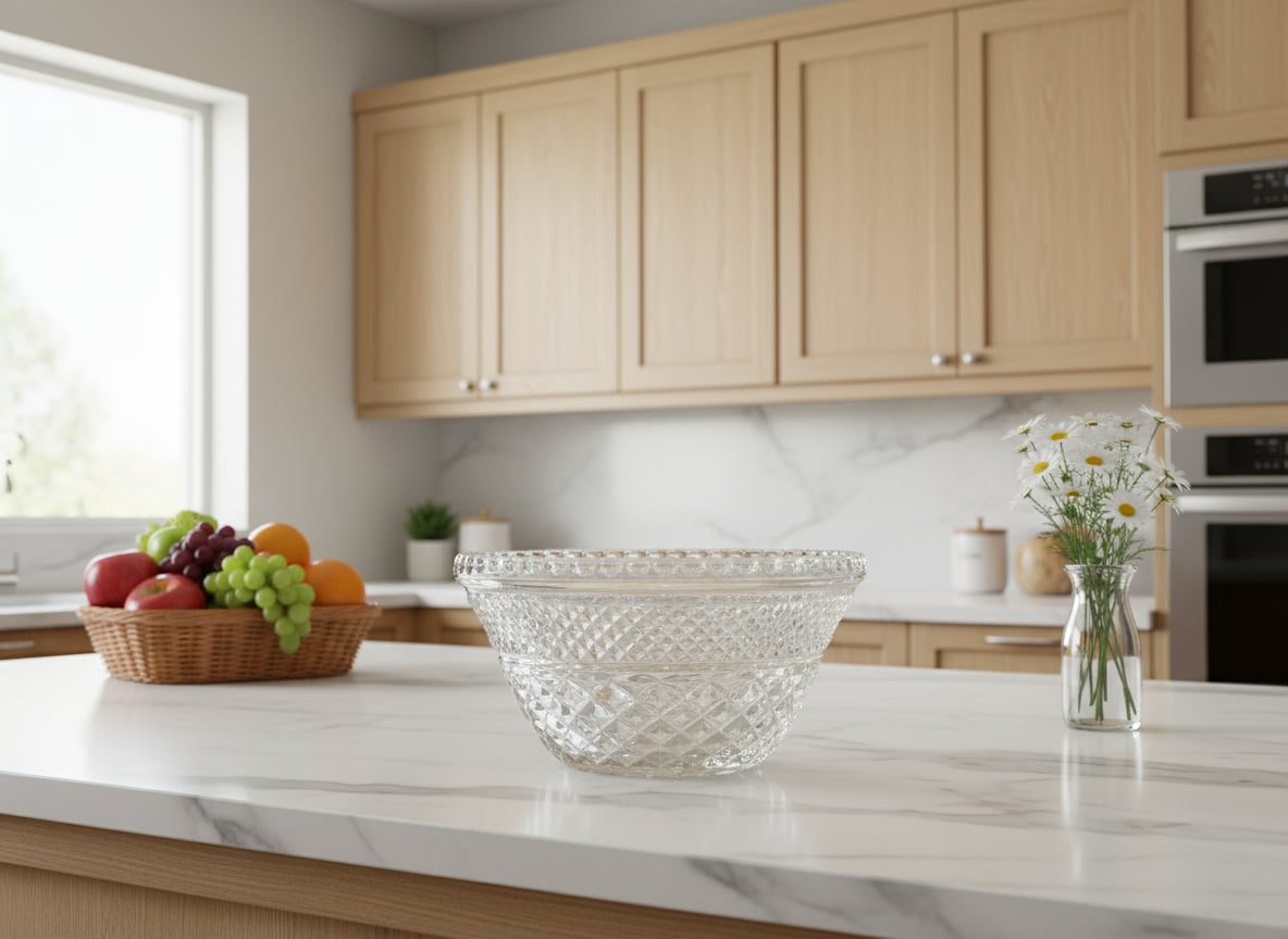 Este tazón multiusos destaca por su distintivo patrón de cuadrícula en relieve tipo gofre y círculos cortados en el borde, ideal para servir ensaladas, frutas, postres o como base para ponchera.