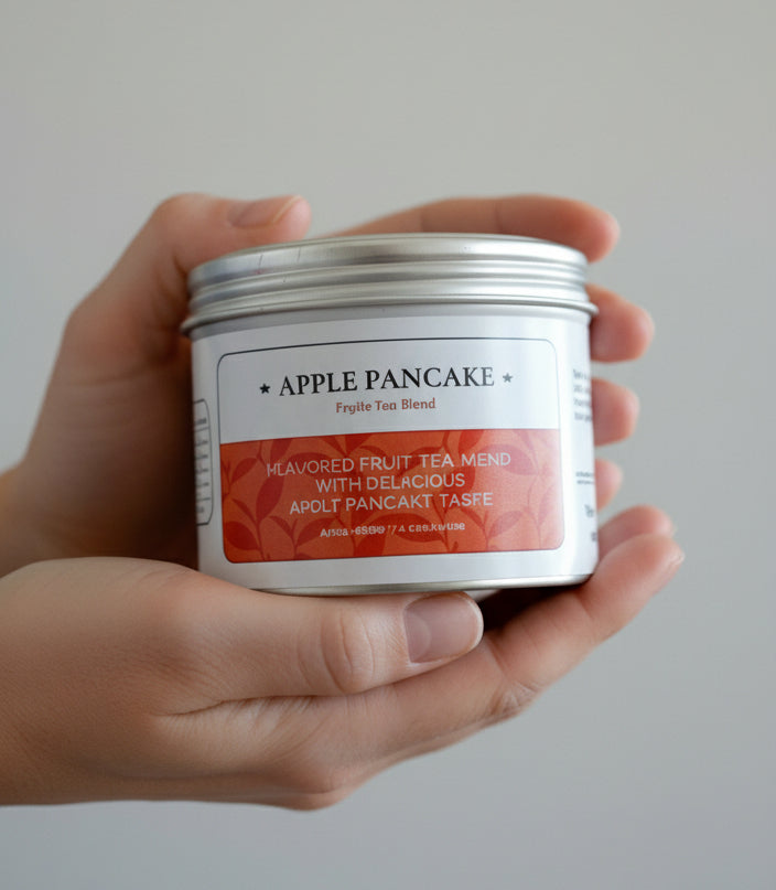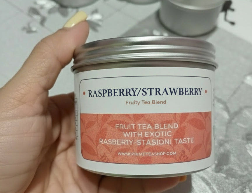 Lata metálica individual con variedades como Ground Apple Blossom, Ground Strawberry, Peppermint, Gold Heart. Té botánico molido estilo gourmet. Marca: PrimeTea.