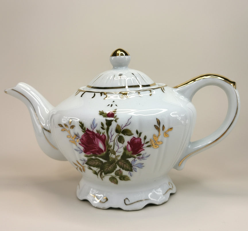 Esta tetera de porcelana blanca, decorada con delicadas rosas en tonos magenta y detalles dorados, es una celebración del refinamiento y la tradición. Su silueta clásica y ornamentación minuciosa evocan tardes de té, conversaciones pausadas y el arte de recibir con gracia.